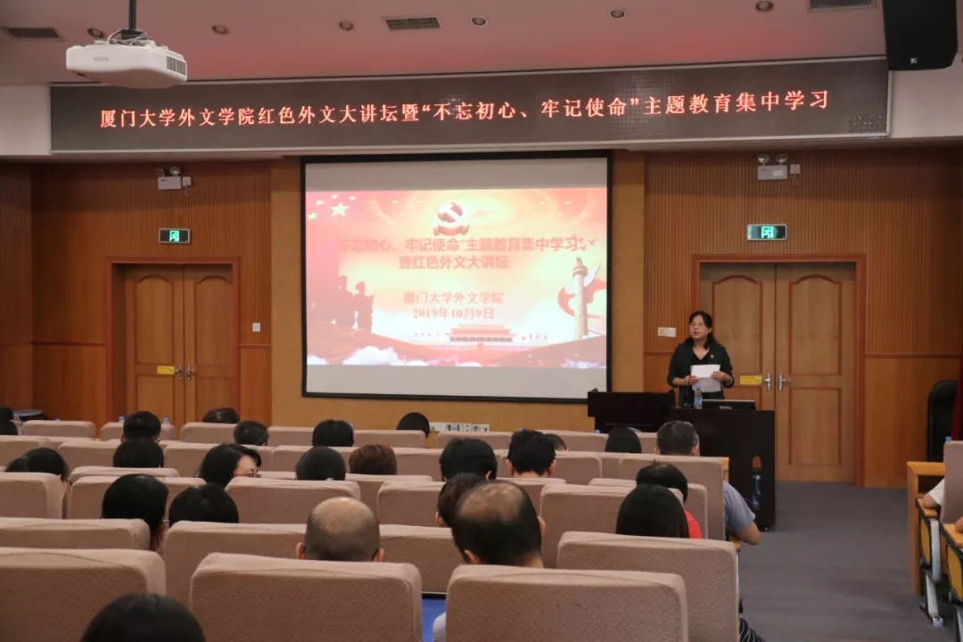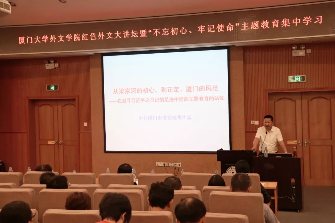 10月9日下午,外文学院党委结合 “不忘初心、牢记使命”主题教育工作部署和双周政治理论学习制度,在化学报告厅组织召开“红色外文大讲坛”暨“不忘初心、牢记使命”主题教育集中学习。活动邀请厦门市委党校原副校长、巡视员邓仕崙教授作了题为《从梁家河的初心,到正定、厦门的风范——在追寻习近平总书记的足迹中提高主题教育的站位》的报告。学院党政领导班子成员,全院教职工、全院学生党员参加学习。报告会由学院党委书记陈志伟主持。
