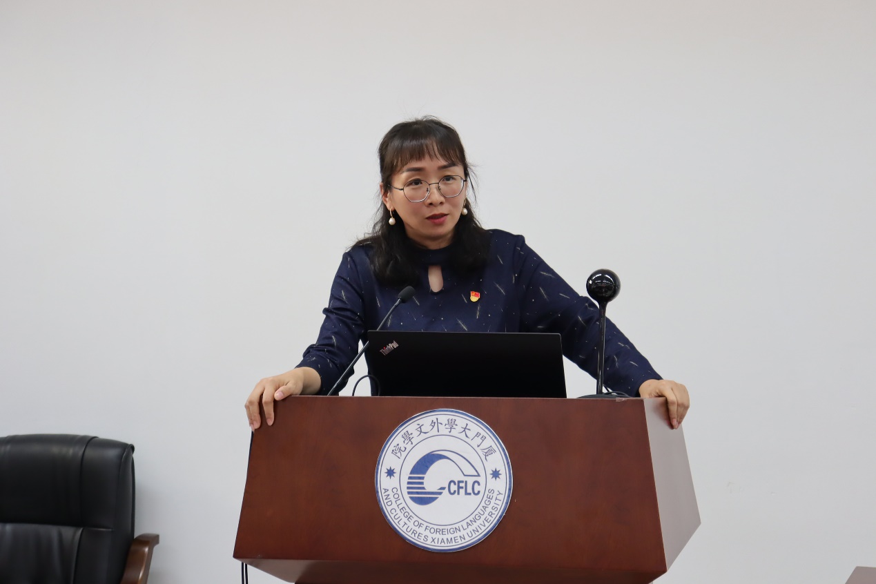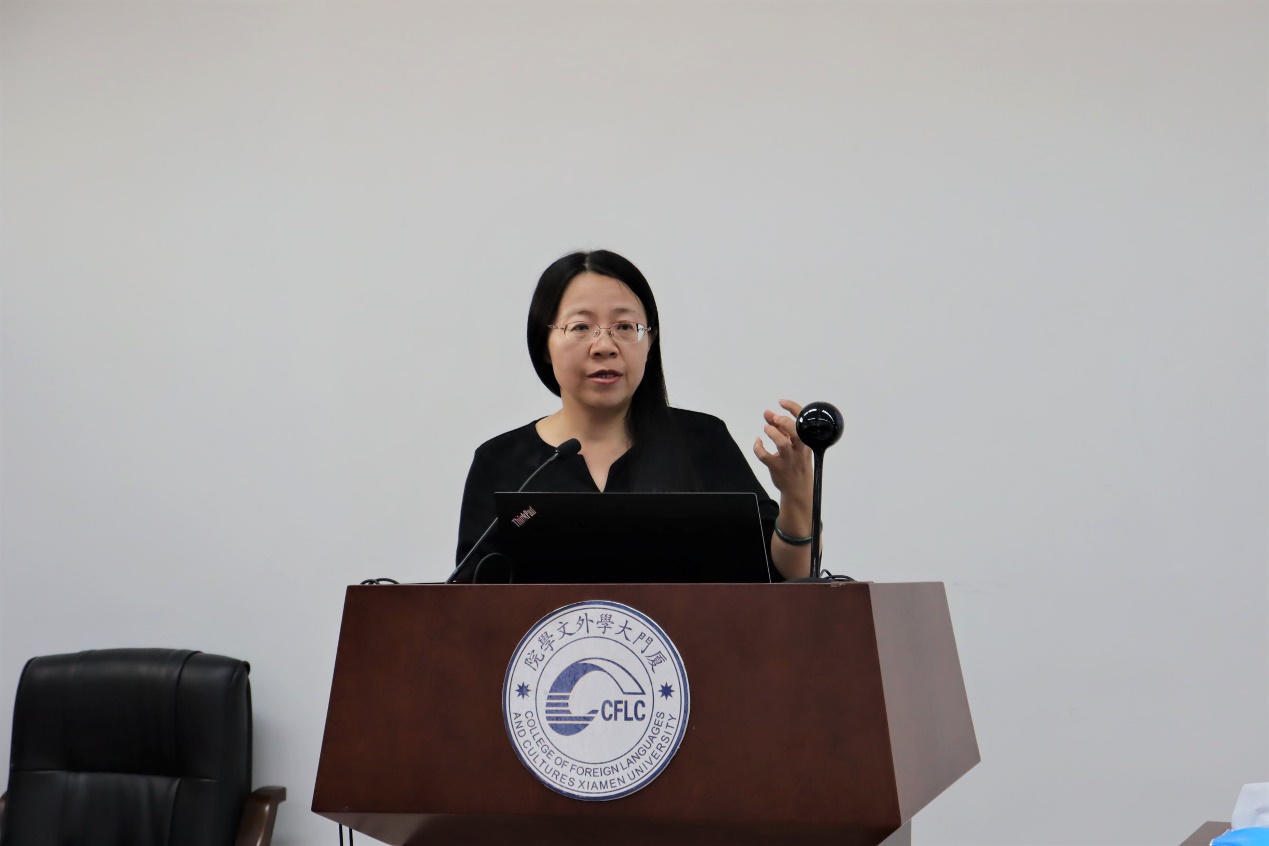 外文学院教授辛志英、副教授汪文娟分别带来课程思政示范课展示。辛志英教授以《英汉修辞对比》为例,展开对课程思政建设的思考,她谈到,课程思政的建设目标是既做到创新点突出,又具有学科特色;既兼顾到思政的不同方面,又与课程的整体设计融为一体;既讲授学科知识,又培养家国情怀、世界格局;对培养具有“四个自信”的文化外宣人才、讲好中国故事的国际型人才提供典型经验和多维合一的培养范式。汪文娟副教授通过现场模拟课堂教学,直接展示课程中的思政元素、育人元素,与现场参会嘉宾、老师开展课程思政的深入交流。