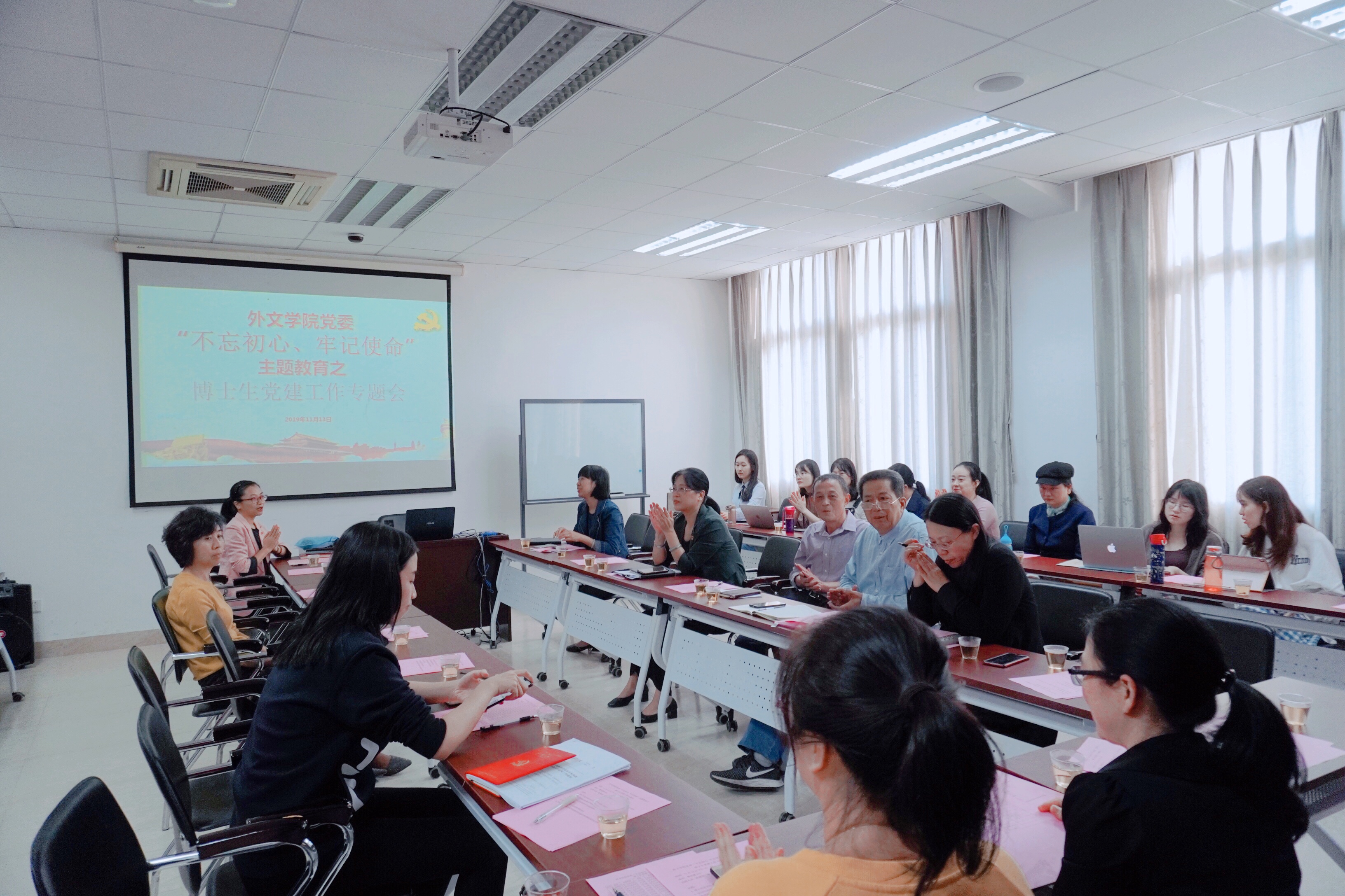 为继续深入推进“不忘初心、牢记使命”主题教育,11月13日下午,外文学院党委在德贞楼319召开“不忘初心、牢记使命”主题教育之博士生党建工作专题会,学院党委书记陈志伟,党委副书记沈丽秀,党委委员、副院长辛志英出席,校党建联络员黄定基到会指导,博士生导师代表杨信彰教授、周郁蓓教授,博士生党员及学院有关工作人员参加了会议,会议由研究生辅导员肖盈主持。