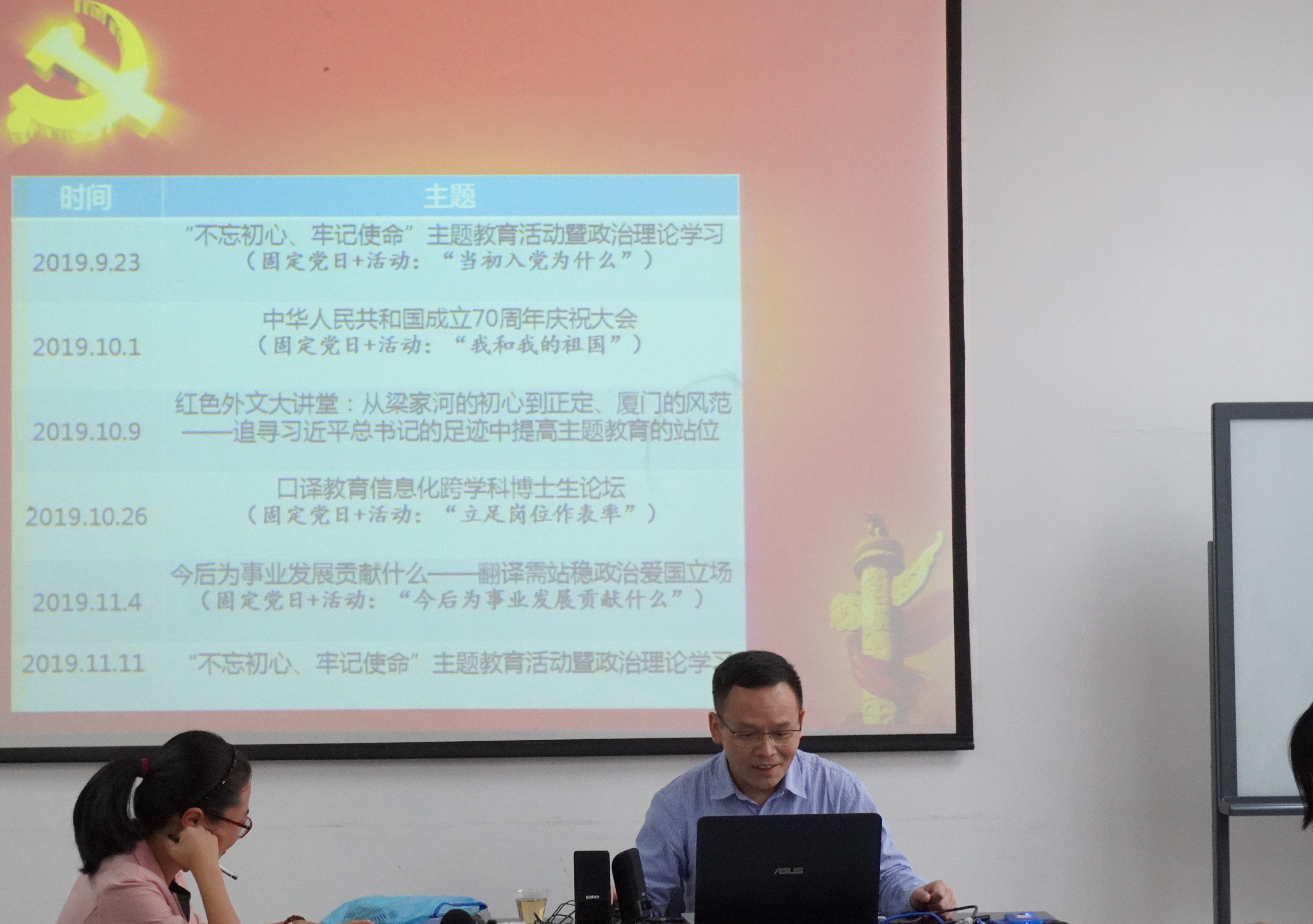 首先,博士生党支部书记吴文梅作支部工作汇报。他总结了本学期,特别是启动“不忘初心、牢记使命”主题教育以来博士生党支部开展的系列教育活动,包括4次“固定党日+”活动和2天集中学习,以及博士生党员积极参加的口译教育信息化跨学科博士论坛等志愿服务工作。