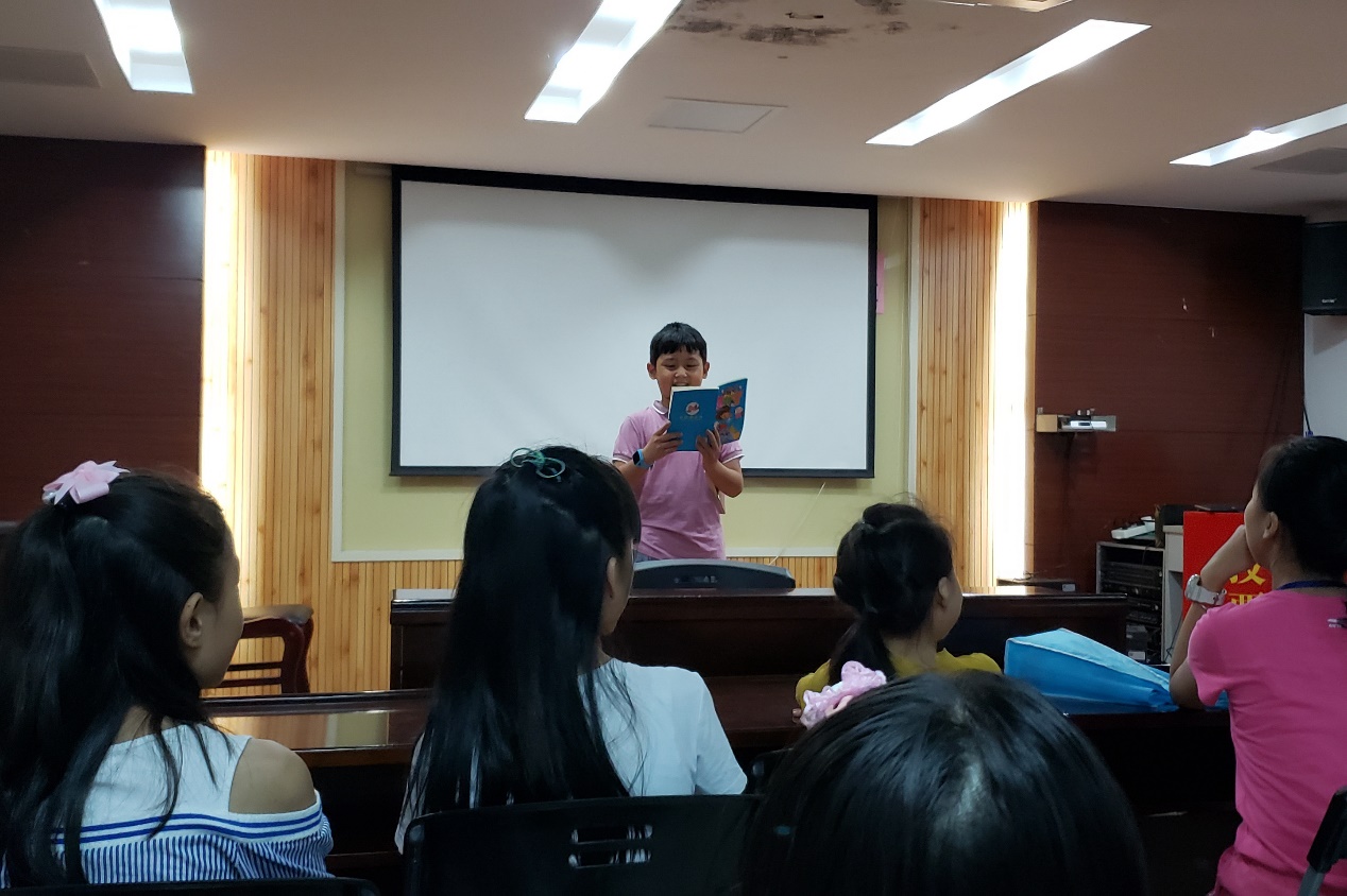 除了趣味科普,实践队员们同样重视营员们对知识的运用。每天1小时的口语演练场中,实践队员们带领营员们练习用所学的生词、句型造句,让营员们对知识的掌握更加熟练。在最初的口语练习中,有一些年级较小的营员过于羞涩,不敢开口。实践队员们通过一对一练习,情景剧模拟、故事复述等方式,还设计了简单的奖励机制,激励营员们都能积极参与,成功调动了营员们的积极性。