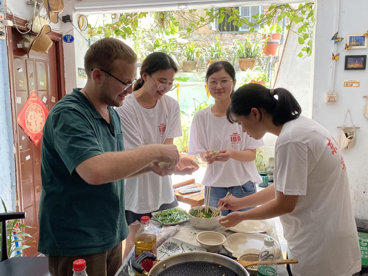 7月10日中午,厦门大学外文学院“东学西渐”暑期社会实践队筹备的中华美食课拉开了帷幕。实践队员们精心准备了制作火锅和饺子的食材并选择了具有家庭气息的地点,为参与课程的留学生打造了轻松愉快却又独一无二的美食体验。实践队员们与留学生共同动手清洗,准备“涮火锅”的丰富食材。在一起下厨的过程中,实践队员们用亲切随和的聊天方式向留学生们简要介绍了火锅的起源、特点、吃法。