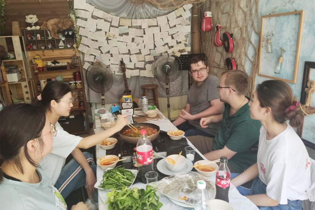 7月10日中午,“东学西渐”暑期社会实践队筹备的中华美食课拉开了帷幕。实践队员们精心准备了制作火锅和饺子的食材,为参与课程的留学生打造了轻松愉快又独一无二的美食体验。实践队员们与留学生一同动手准备各类“涮火锅”的丰富食材。在一起下厨的过程中,实践队员详细地向留学生们介绍了火锅的起源、特点、吃法及文化。