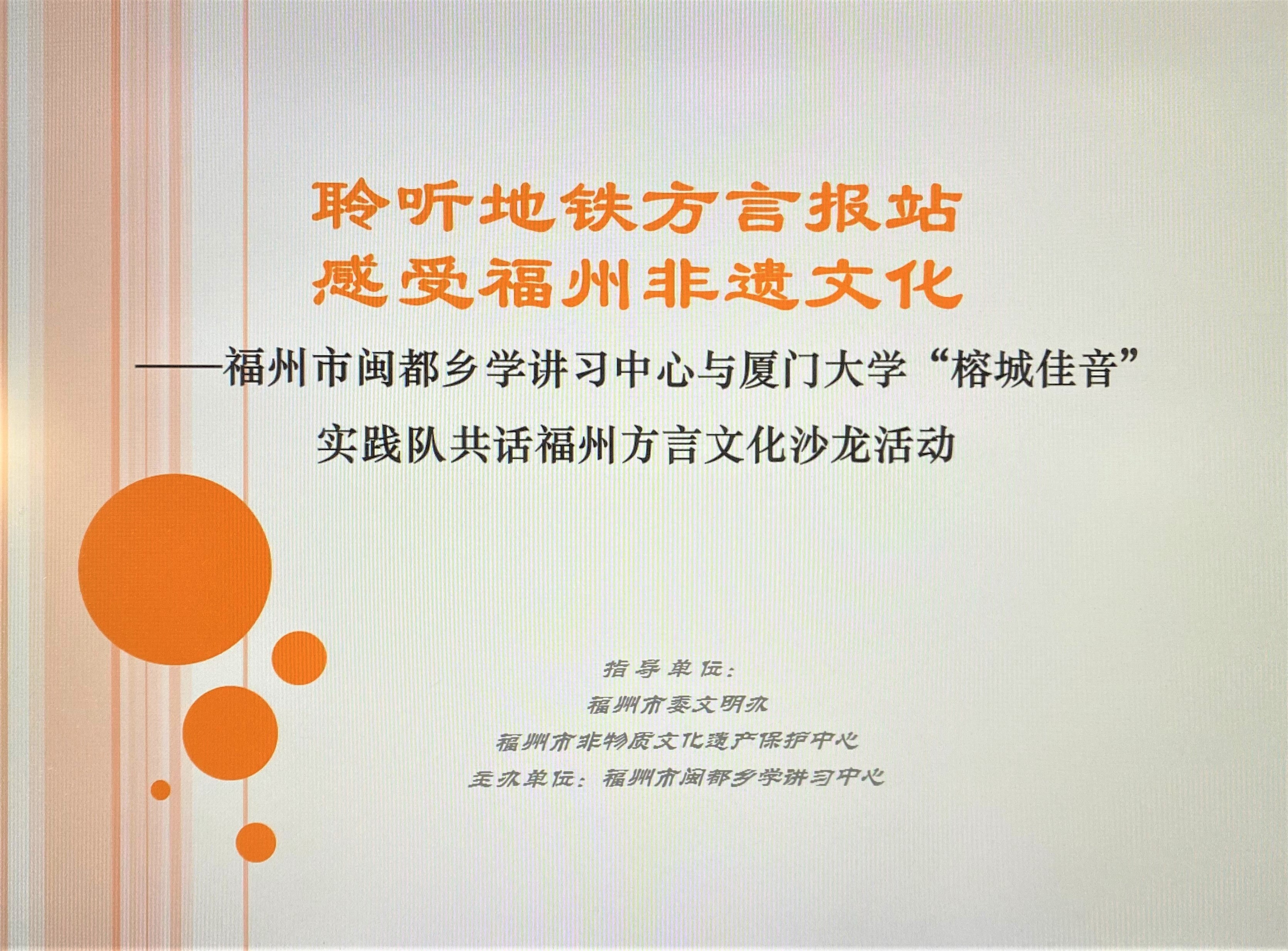 实践队于线上与福州市闽都乡学讲习中心成功举办地铁与方言文化沙龙。本次沙龙由福州市委文明办和市非遗保护中心指导,福州市闽都乡学讲习中心主办,福州方言、地方文史专家榕城老师策划,福州地铁方言播报人郭铃主持,并得到了各界热心保护和传承福州方言的专家人士的支持。