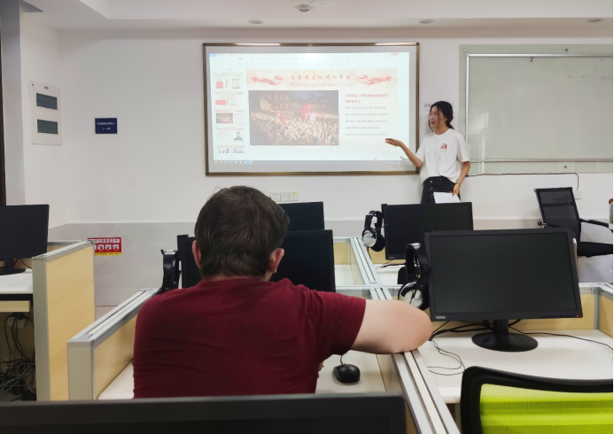 7月6日上午,实践队以“回顾建党历史”为主题,为留学生们讲授中国共产党的诞生及其为中国带来的翻天覆地的变化。基于参与课程的留学生的中文水平,实践队员张书萍等同学全程使用英语进行了细致生动的讲解。