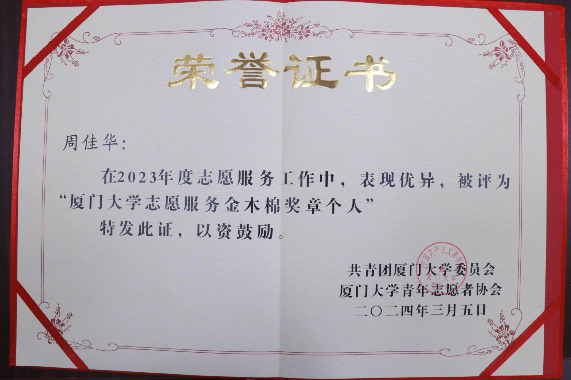 戴晓阳荣获“厦门大学志愿服务金木棉奖章个人”