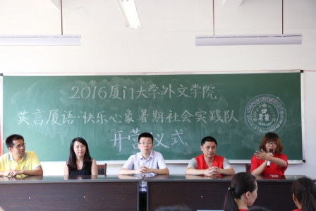 7月23日上午,经过三个多小时的舟车劳顿,“英言厦语•快乐心象”暑期社会实践队到达了美丽的泉州市安溪县湖上中学。在短暂的休息后,于下午三时举行了开营仪式。此次开营仪式有幸邀请到湖上乡纪委书记叶明昆、安溪茜茜公益协会会长陈艺德莅临,来自厦门大学外文学院的实践队全体成员、快乐学习教育科技集团代表、湖上中学的同学们共同参加了本次开营仪式。
