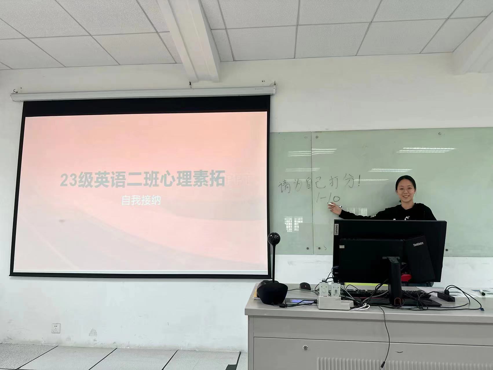 英专二班设计了“请为自己打分!”素拓环节,借助心理影片让大家进行自我评价,同学们围绕“自我”进行讨论,并分享了许多促进自我接纳的方法。