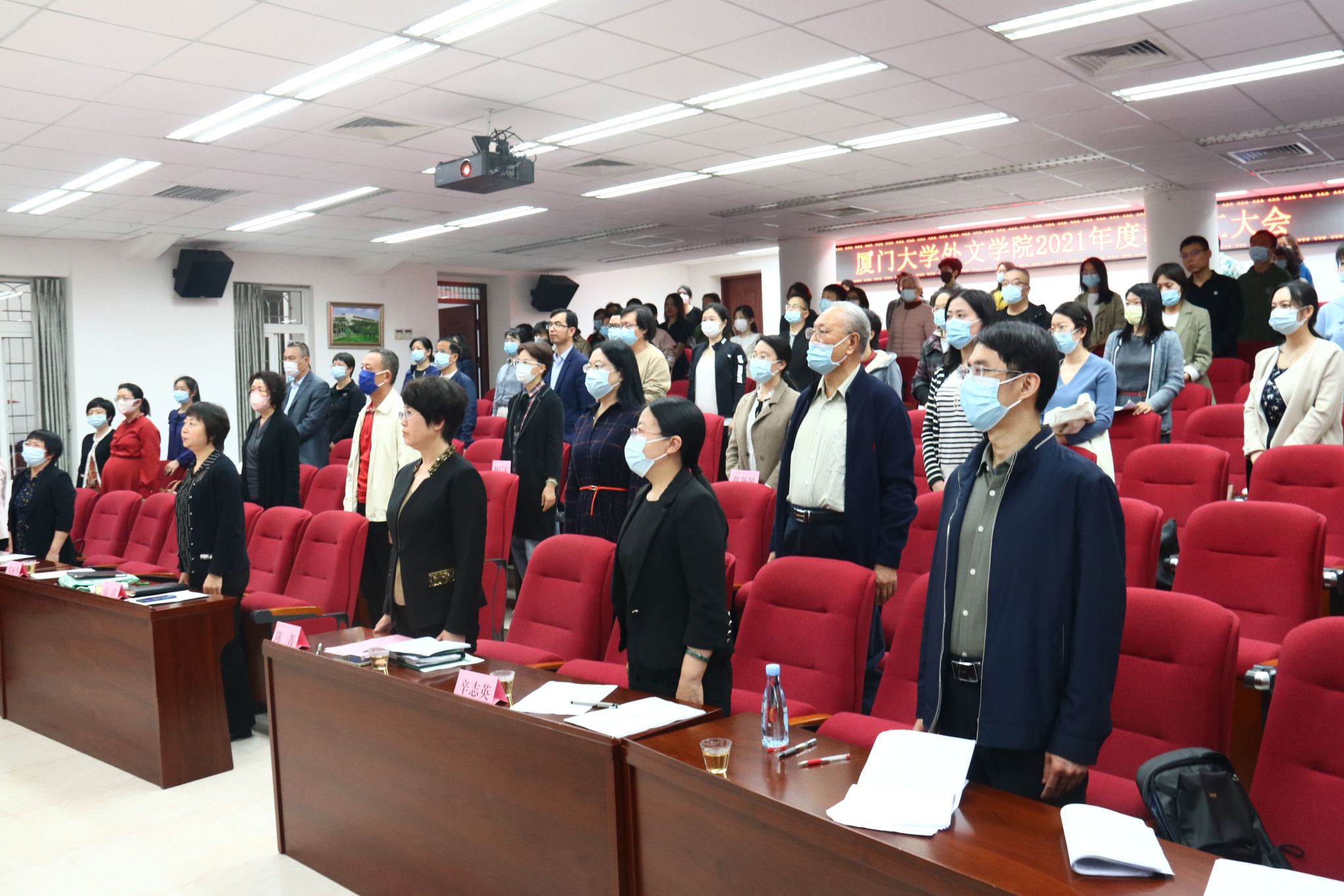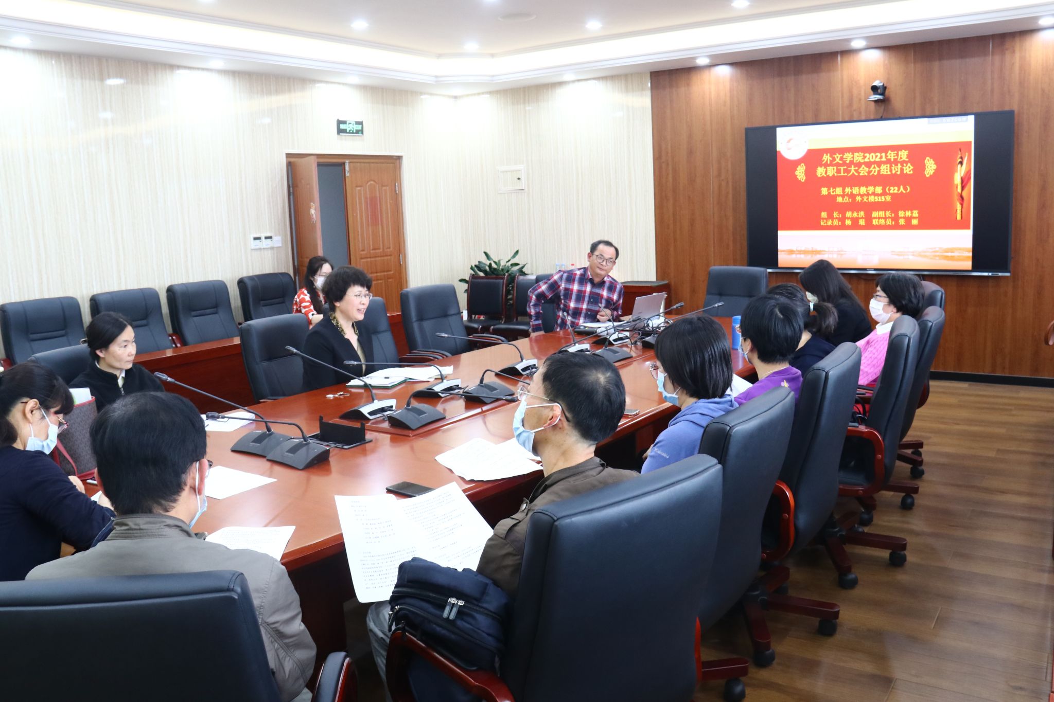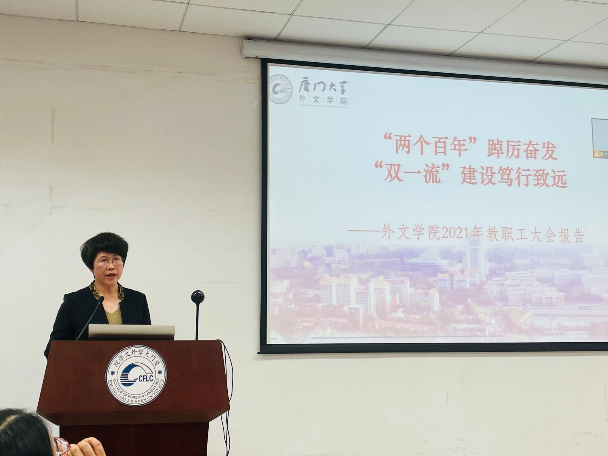 4月20日下午,外文学院在南光三112报告厅及313会议室成功召开2021年度教职工大会。学院党政领导、退休教师代表以及全体教职工出席大会,会议由工会主席潘宁主持。
