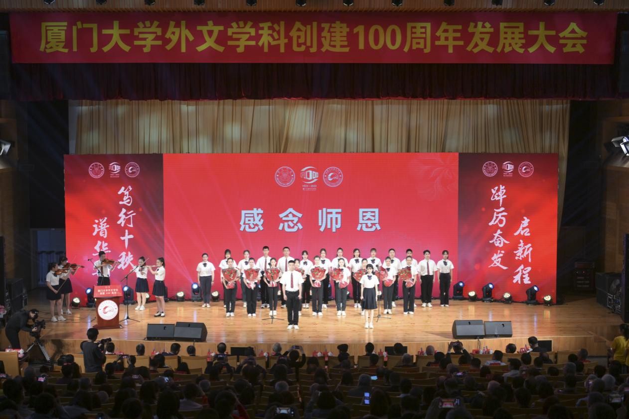 一脉师德,润泽桃李,感念师恩,薪火赓续。一百年来,一代又一代的外文教师不忘从教初心,牢记育人使命,在教学与科研战线上辛勤耕耘,竭诚付出,为厦大外文的发展做出了巨大的贡献。大会特别举行了感念师恩环节,在深情的朗诵和歌声中,学生们搀扶着白发婆娑、耄耋之年的退休教师们走上舞台中央,为他们送上感恩的鲜花和诚挚的祝福。