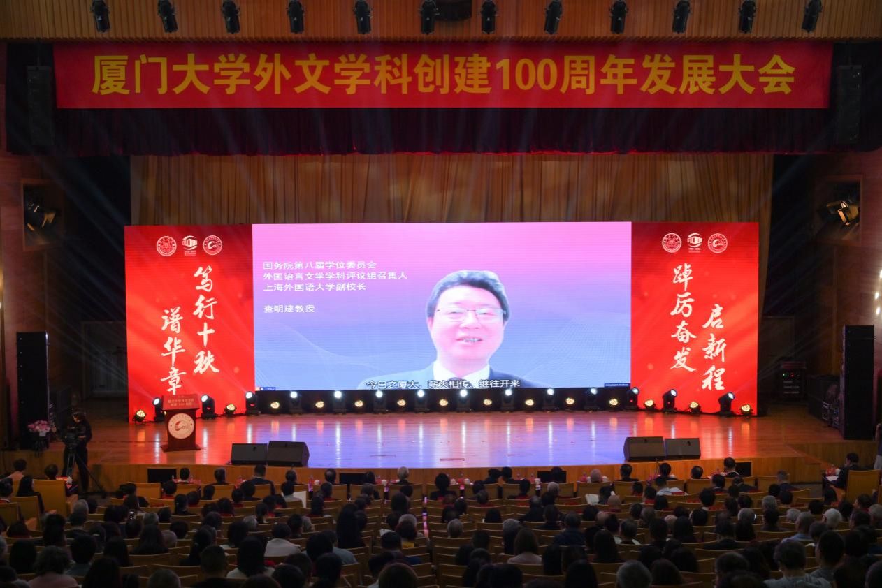 上海外国语大学副校长查明建在视频致辞中肯定了百年来外文学科取得的突出成就和为我国外语教育做出的卓越贡献,并祝愿外文学科能够百尺竿头、更上层楼,在新时代创造外语学科新的辉煌。