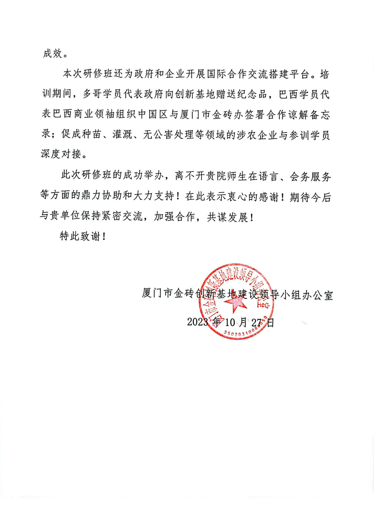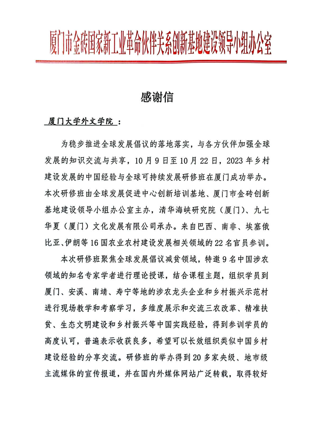 近日,厦门市金砖创新基地建设领导小组办公室向外文学院发来感谢信,对外文学院及其口译师生团队表示衷心感谢。