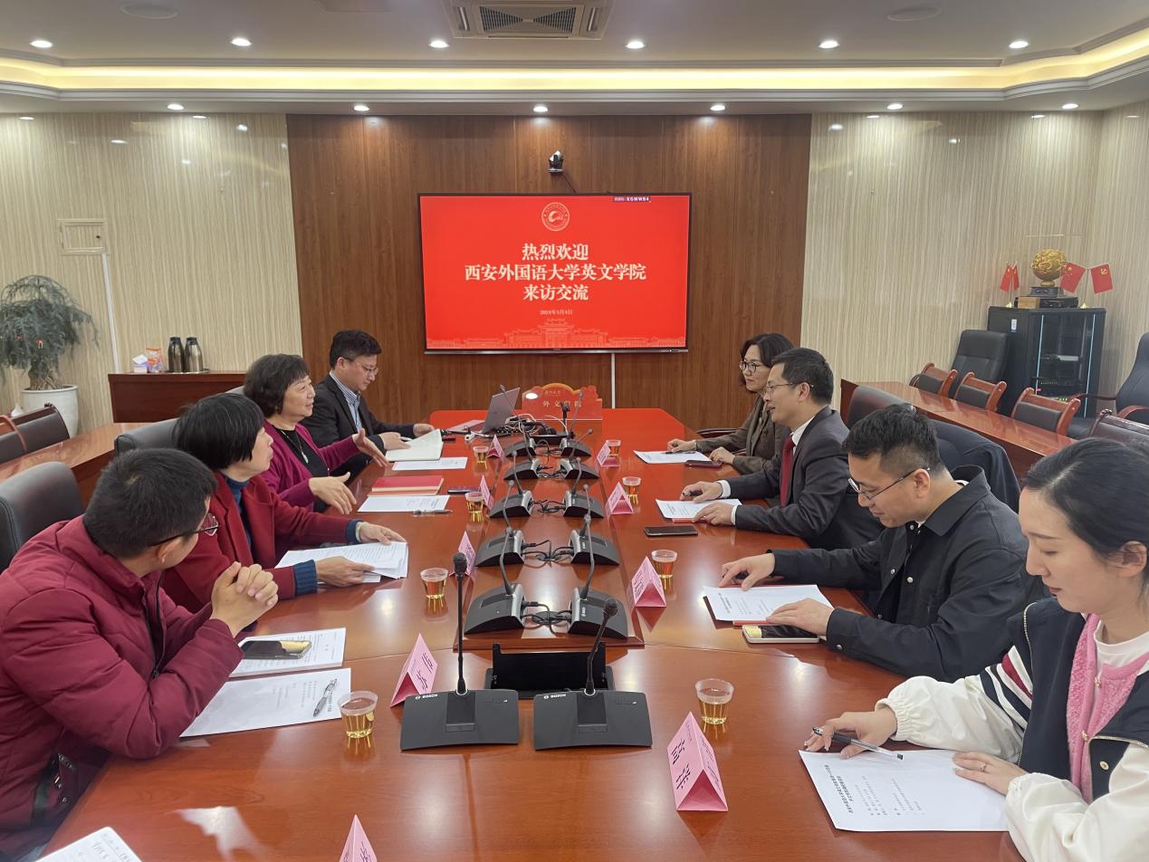 3月4日,西安外国语大学英文学院院长张凌一行来访我院,学院党委书记徐琪,副书记张胜强、沈丽秀接待来访团组并与来宾座谈交流。