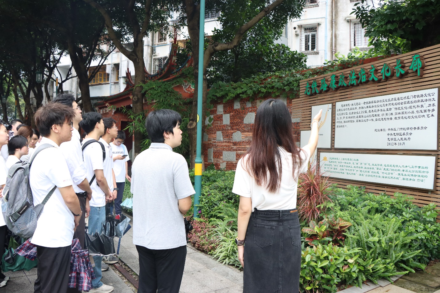 在胶卷盒雕塑、红砖古厝、“宝‘廉’灯”仿真交通灯等地标参观的同时,外文学院本科生第五党支部书记唐祯讲述廉洁法治专题微党课。她从“缇萦救父”、刘邦“约法三章”等历史法治典故讲起,讲到于成龙“勿以官小而不廉,勿以事小而不勤”廉洁为民的治闽故事,并结合雷锋、孔繁森、焦裕禄、谷文昌等时代楷模一心为民的先进事迹,呼吁青年党员应时刻牢记党员身份和职责,努力提高纪律意识和廉洁意识,牢固树立法治思维,以对党和人民高度负责的态度,刻苦学习,埋头苦干,写好时代之问的青春答卷。