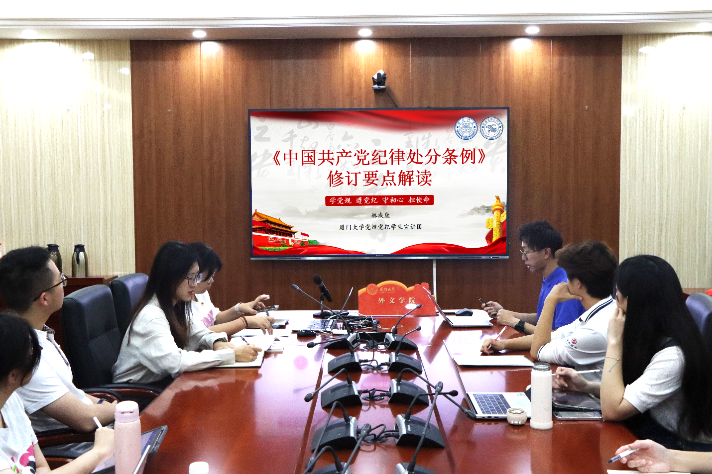 5月29日晚,党员们齐聚南光三515会议室开展专题研讨会。法学院2023级硕士研究生、厦门大学党规党纪学生宣讲团成员、第六期“扬才班”学员林成康以“学党规遵党纪,守初心担使命”为题,从《中国共产党纪律处分条例》(以下简称《条例》)修订情况讲起,以案说例,详细解读了《条例》修订要点。他指出,本次《条例》修订呈现出“严明政治纪律和政治规矩”“加强全方位管理和经常性监督”“引导激励党员干部敢于担当、积极作为”“坚持党性党风党纪一起抓”“促进执纪执法贯通”五个鲜明特征,凝结了党的创新理论成果蕴含的立场观点方法,为纪律执行提供了有力有效的指导和规范可靠的依据,为纵深推进新时代全面从严治党提供了坚强纪律保障。他呼吁党员同志要不断加深对《条例》的理解和把握,做到学习《条例》入脑入心、践行《条例》自觉坚定,始终保持忠诚干净担当的政治本色。