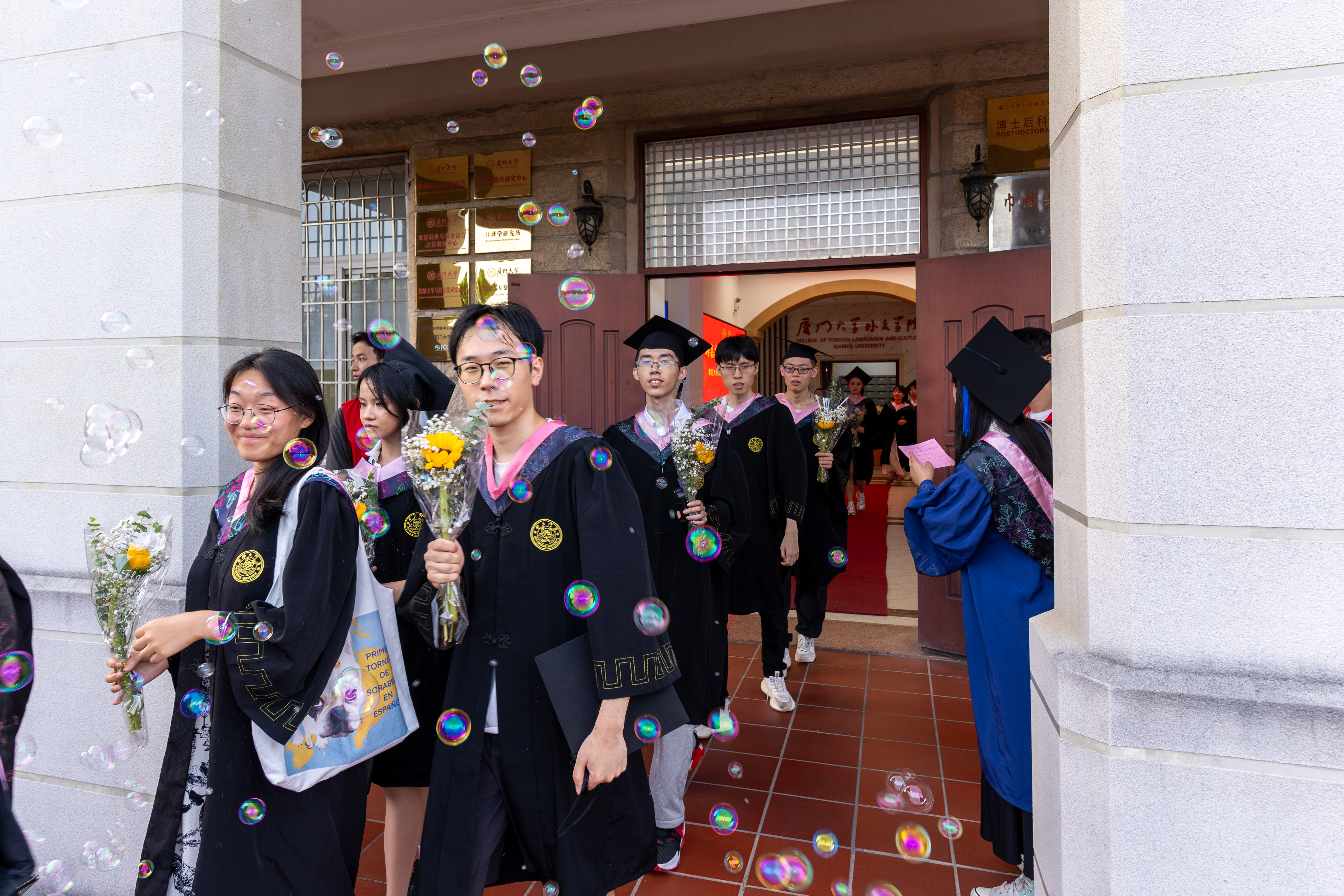 典礼正式开始前,全体毕业生手捧花束,沿着学院大楼阶梯缓缓而下,款款走进会场。在漫天飞舞的五彩气泡中,青春的面孔洋溢着对未来的欣喜与期待,一如手中盛开的向日葵,向阳而生,雀跃鲜活。