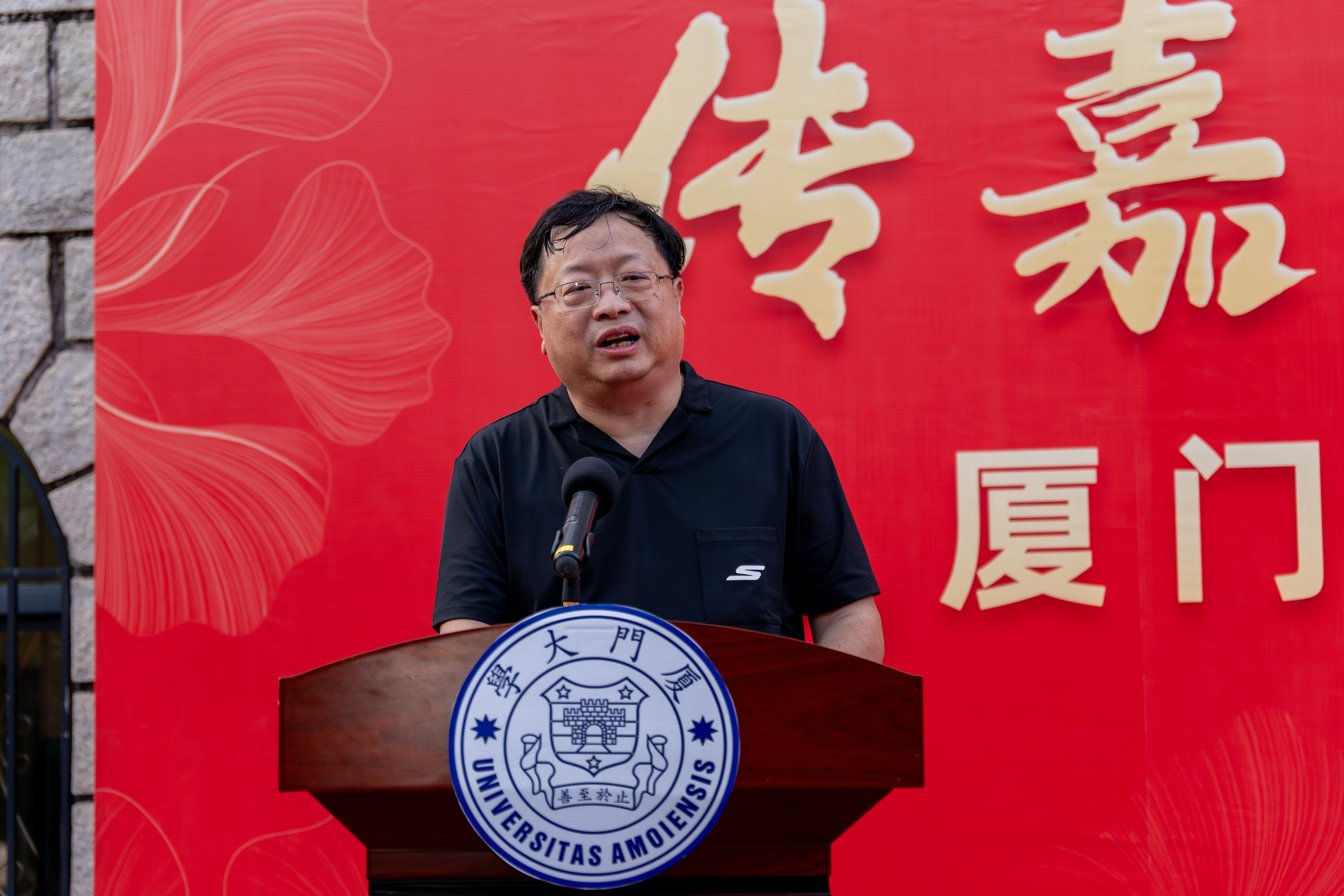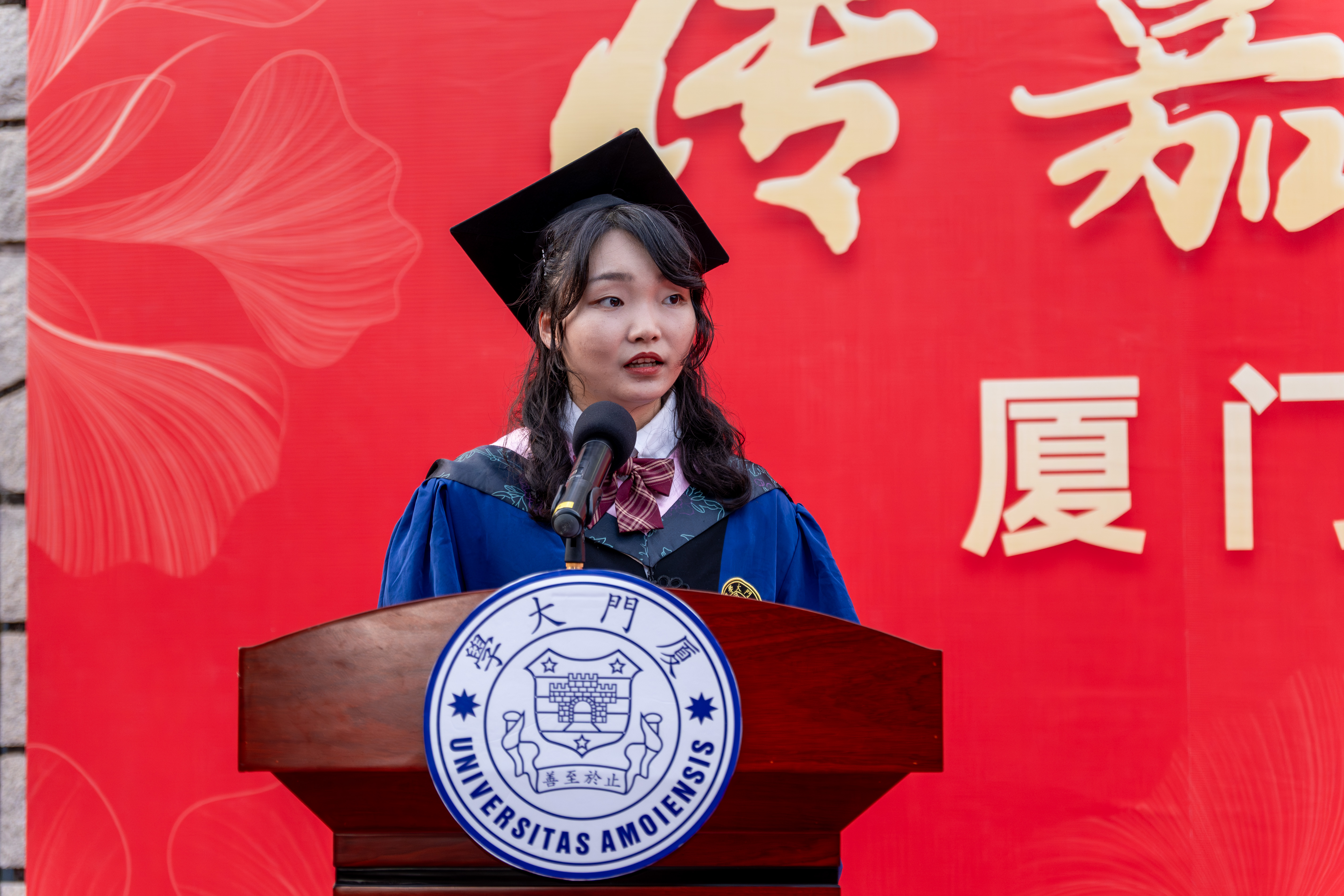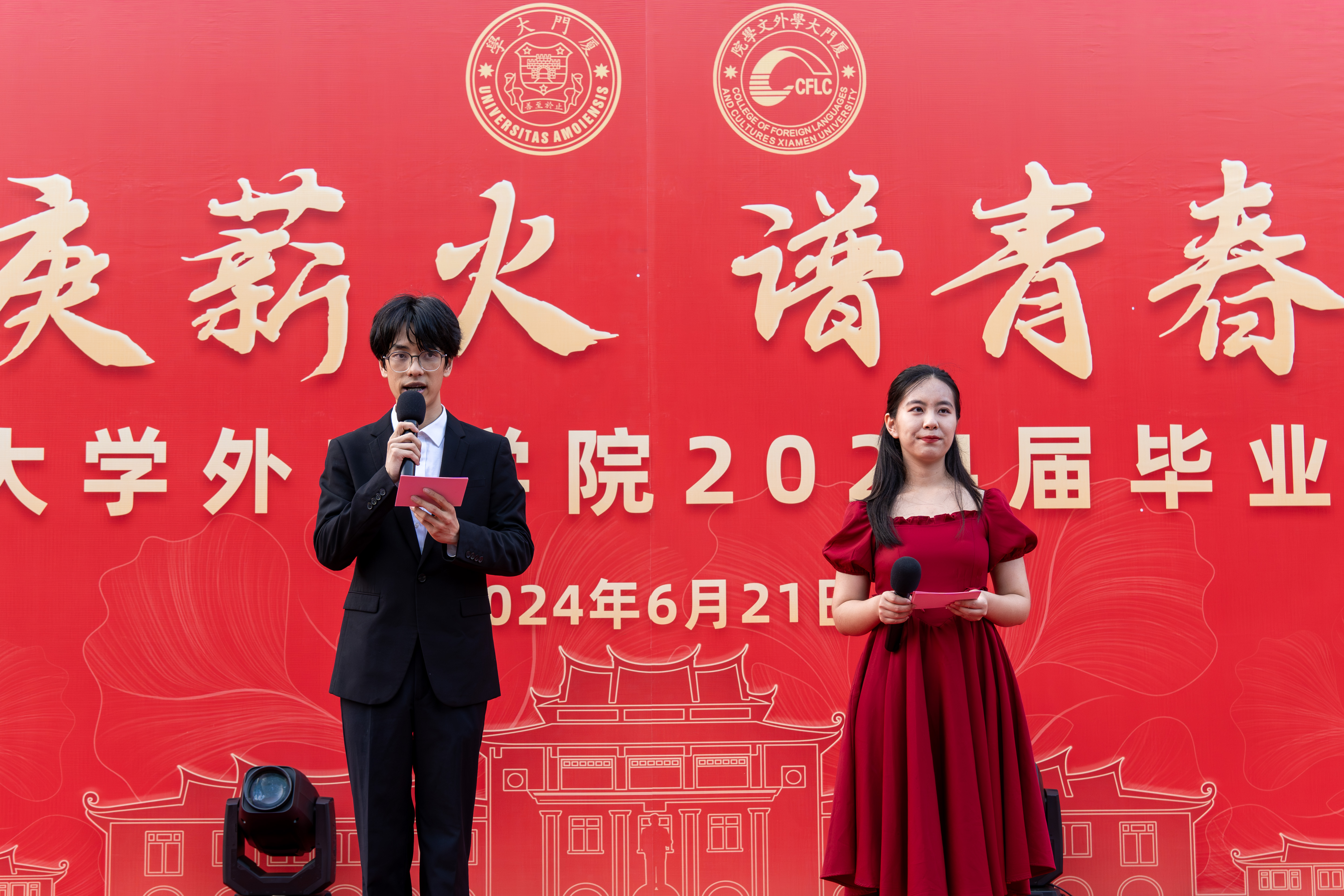 卞开祥学长为学弟学妹们送上真挚的寄语。他回顾自己离开校园后的奋斗历程,感念于母校给予的人文熏陶和在外文学习时所获得的专业知识和人生智慧,使自己能够在往后的人生道路上,始终牢记“厦大人”的使命与担当,铭记责任,勇敢前行,并在事业蓬勃发展之时常怀感恩之情,回馈母校,传承嘉庚精神。他嘱咐毕业生们保持谦卑的姿态,涵养开阔的眼界,肩负起时代赋予的责任,为社会的繁荣和进步贡献外文学子之力量。