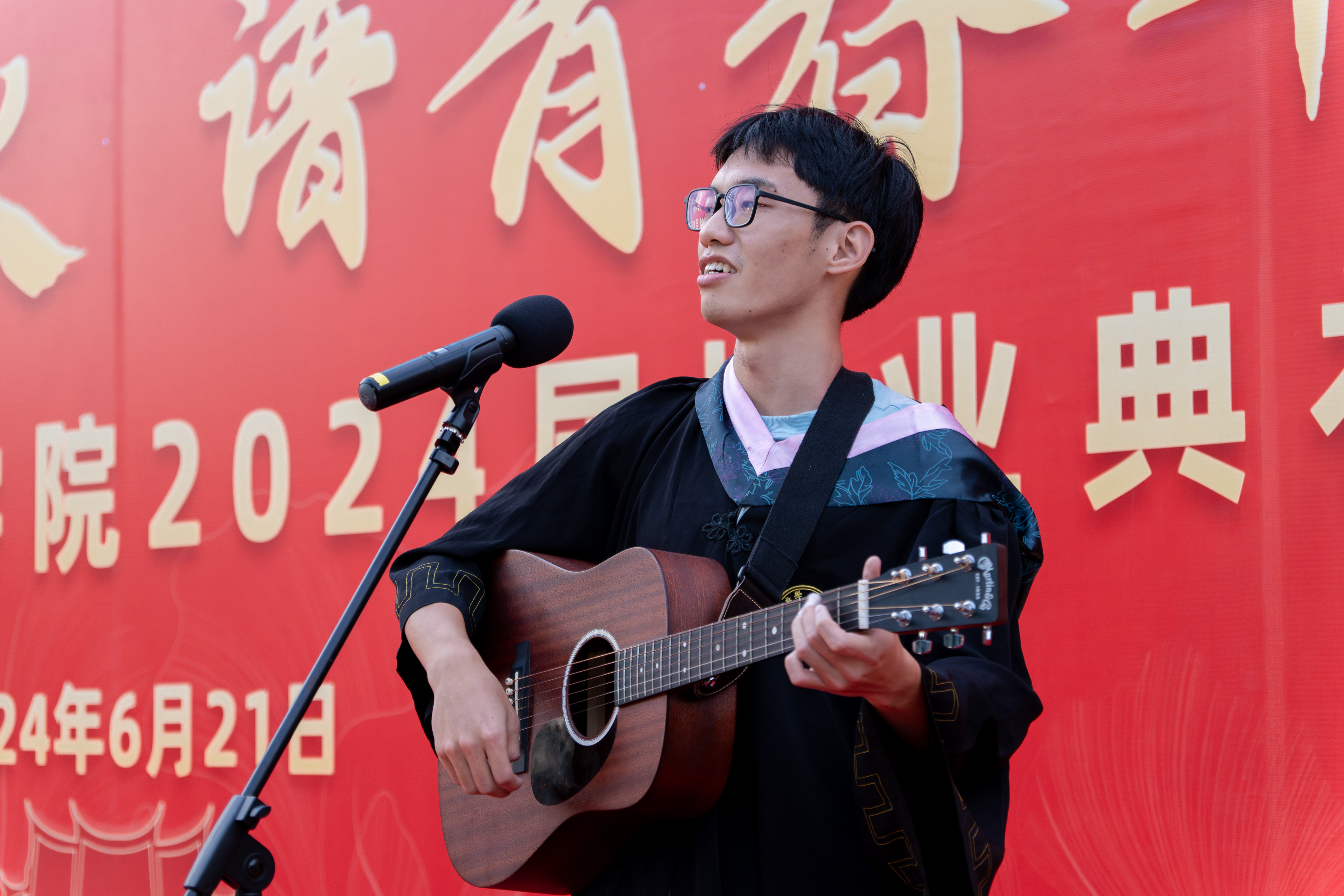 教师与毕业生代表伴随着音乐的鼓点走上舞台,深情演唱了《再见》《See You Again》和《凤凰花季》。台下的师生们也跟随节奏,一同挥动起手中的花束,大声合唱。在歌声中,毕业生们拥抱、合影、交谈、跟唱,用各自的方式与朝夕为伴的老师、同学们道别,也告别了自己独一无二的大学时光。