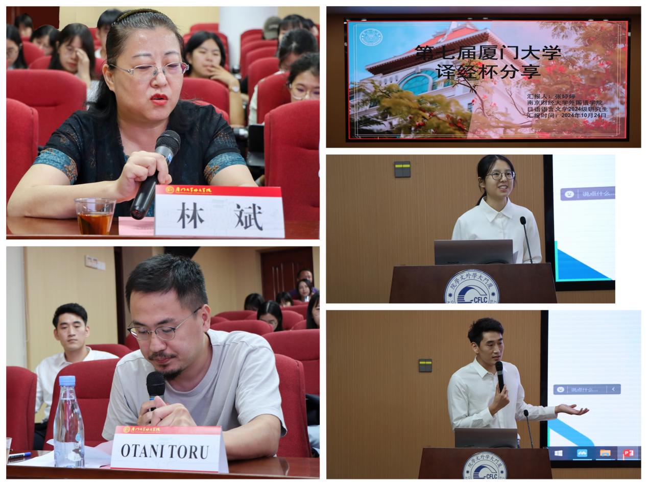 在优秀作品展示环节,三位获奖选手依次分享了自己的参赛心得。南京财经大学外国语学院2024级日语语言文学专业研究生张婷婷从原文理解、翻译过程、心得体会三个方面进行了分享,通过译文实例阐述五大翻译重点:文言文风格的保留、敬语的运用、句式结构的调整、专有名词的处理、韵律节奏的保持。厦门大学外文学院2023级英语笔译专业研究生罗丹雪则着重分享了翻译过程中的两大翻译难点,一是敬辞和谦词的翻译策略,二是翻译语体的选择。通过斟酌考量,译者巧妙运用省译、意译、对等翻译等策略来处理敬辞和谦词,同时基于服务受众的原则进行翻译。厦门大学外文学院2023级英语口译专业研究生刘健康围绕“Three Waves”分别从敬畏、定位、韵味三个方面展开分享,敬畏是指要尊重作者和原文,定位是指要明确读者是谁、作者是谁、我是谁三大问题,韵味是指要追求内容和形式的平衡。