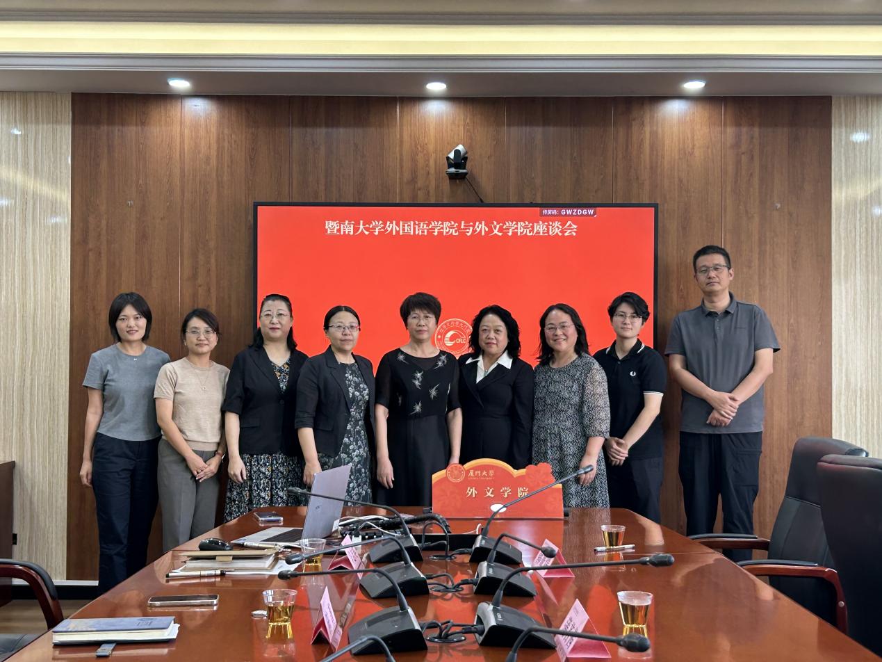 暨南大学外国语学院商务英语系主任韩征瑞、日语系主任陈凤川、西班牙语系教研室主任郭露露,以及我院英语系副主任林斌、日语系高年级教研室主任王晓雨、西班牙语专业教师孙敏一起参加了座谈交流。