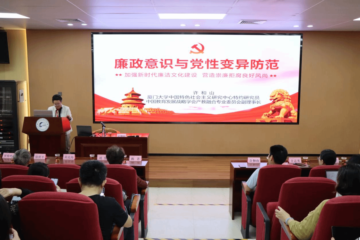 为扎实推进深入贯彻中央八项规定精神学习教育走深走实,引导师生党员筑牢思想防线,永葆廉洁本色,4月28日下午,外文学院开展师生党员集中培训专题教学暨第二十八期红色外文大讲坛。本次活动邀请厦门大学中国特色社会主义研究中心特约研究员、继续教育学院原院长许和山作题为《廉政意识与党性变异防范——加强新时代廉洁文化建设营造崇廉拒腐良好风尚》的报告。活动由学院党委副书记罗俊峰主持,学院全体师生党员、“红心向党”成长营之学生入党积极分子2025年春季集中培训班学员参加培训。