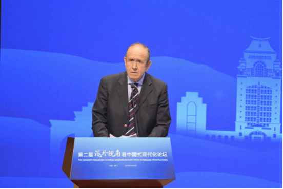 26日上午论坛开幕,外文学院党委书记徐琪主持开幕式。厦门大学党委书记、中国科学院院士张荣代表主办方致辞,他结合中欧建交50周年背景,围绕中国式现代化的实践成就与理论创新,强调通过文明互鉴深化中外对话,呼吁中外学者共同探讨现代化进程中的共性问题与多元路径,为构建人类命运共同体贡献智慧和力量。“一带一路”绿色发展国际联盟主席、欧盟亚洲中心主席、联合国前副秘书长埃里克·索尔海姆(Erik Solheim)指出,当今世界正面临诸多挑战,我们更应通过国际合作寻找解决之道。他强调,中国将经济发展与生态保护相结合的实践值得关注,各国分享经验、推动合作是应对全球挑战的关键路径。外文学院院长陈菁希望论坛能够充分发挥启智聚力的平台作用,为深化文明互鉴与全球治理贡献智慧。
