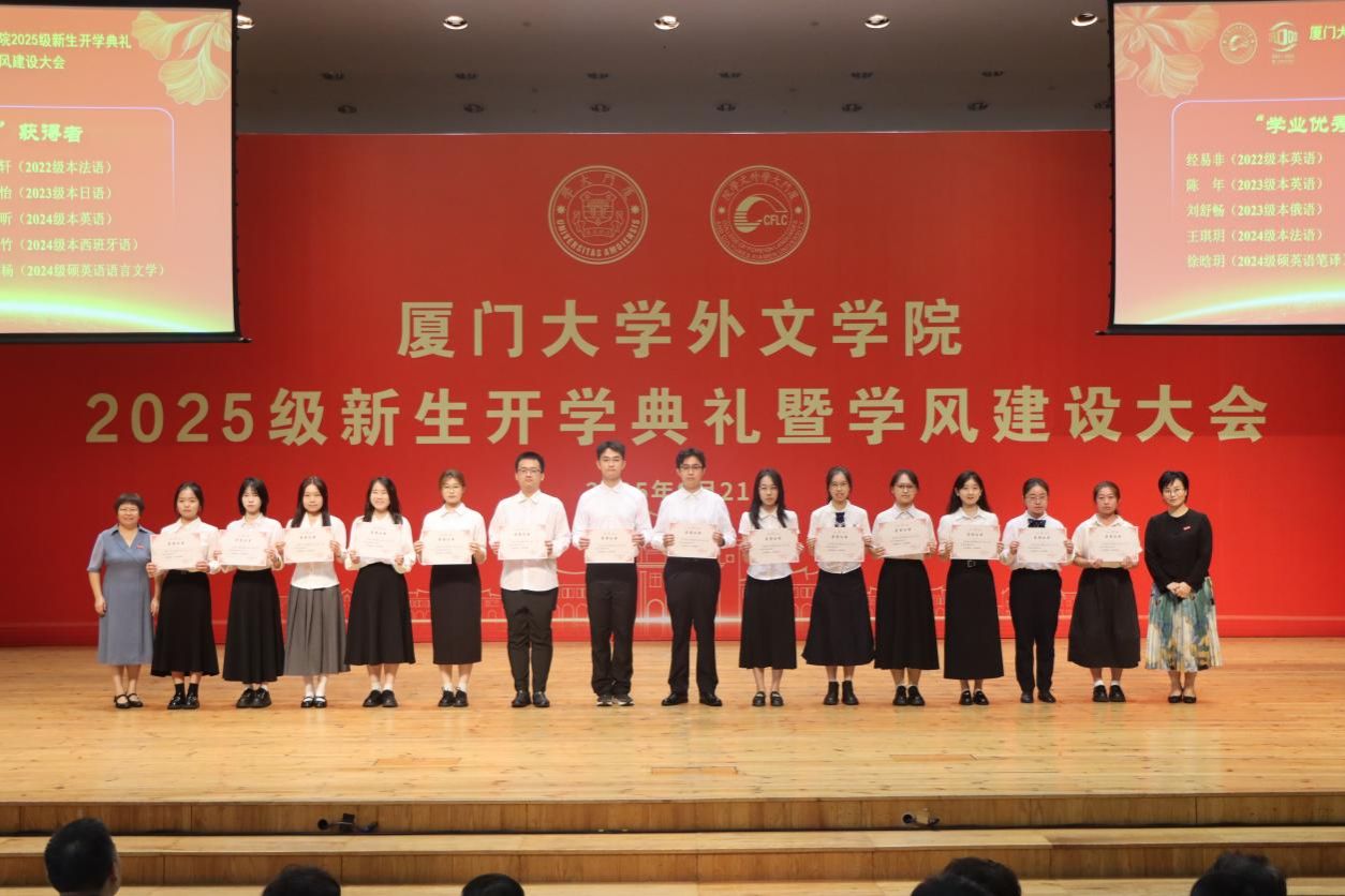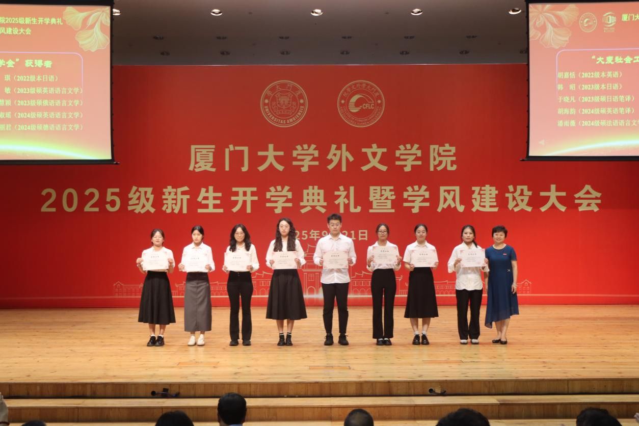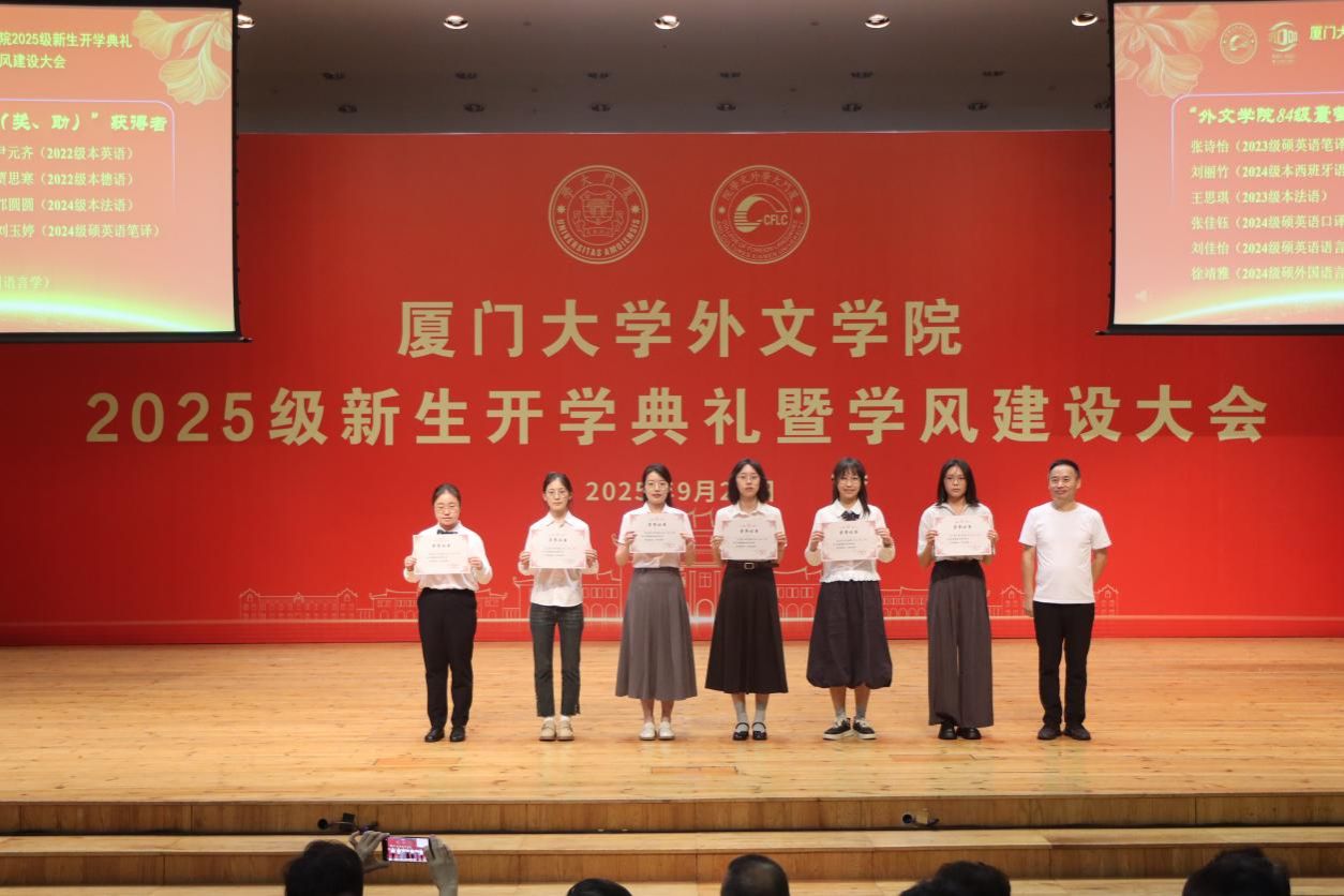 徐琪、陈菁、罗俊峰、辛志英、江桂英,学院副院长刘悦、戴鸿斌等学院领导、教师代表,以及林加维校友夫妇、刘宝刚、苏子惺、吴庆东等校友,分别为“大麦社会工作奖学金”“法语系凤凰花奖学金”“林加维奖学金、助学金”等各类奖项获得者颁发证书,现场掌声不断,激励全体学子向优秀看齐。
