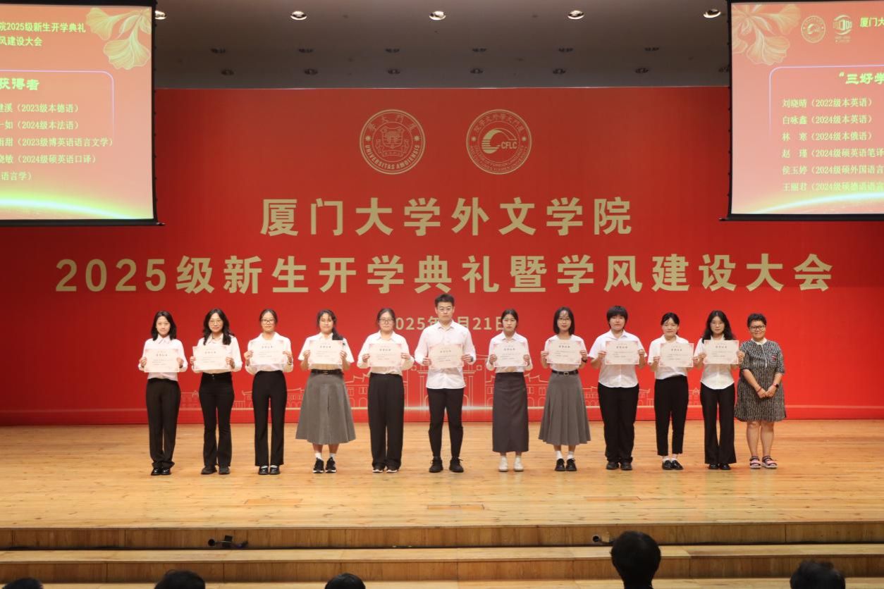 9月21日下午3时,厦门大学外文学院2025级新生开学典礼暨学风建设大会在科学艺术中心二楼音乐厅隆重召开。321位2025级新生齐聚一堂,开启大学生涯新篇章。学院1977级校友苏子惺、吴庆东,1984级校友刘宝刚,1992级校友蒋驰,2001级校友林加维及其夫人肖晓萍,学院党委书记徐琪、院长陈菁等党政班子成员、各系部负责人、新生班主任及教师代表出席大会。大会由院党委副书记郑辉主持。
