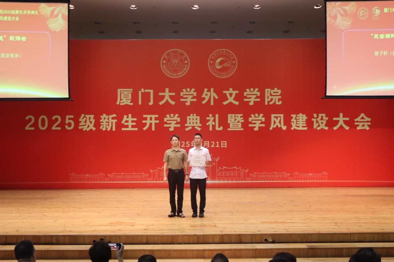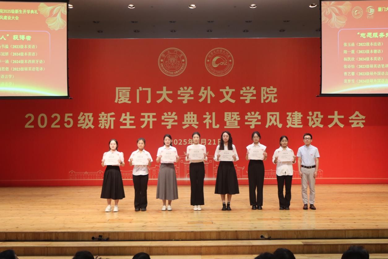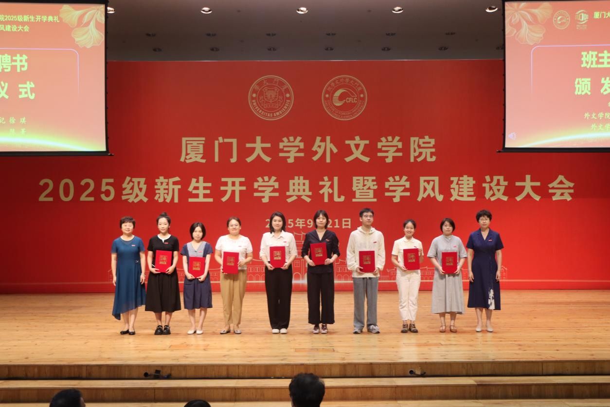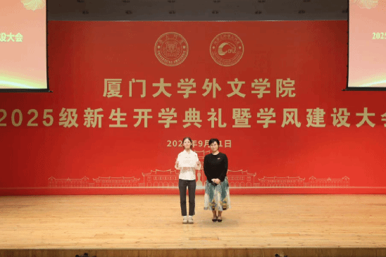 班主任是新生成长的重要引路人。大会现场举行2025级本科生班主任及新聘任班主任聘书颁发仪式,徐琪、陈菁为新生班主新聘班主任代表颁发聘书,期待他们为学生成长保驾护航。随后,系部领导与班主任代表为新生代表佩戴校徽,校徽象征着厦大“开放包容、止于至善”的理念,标志着新生正式融入厦大外文大家庭。