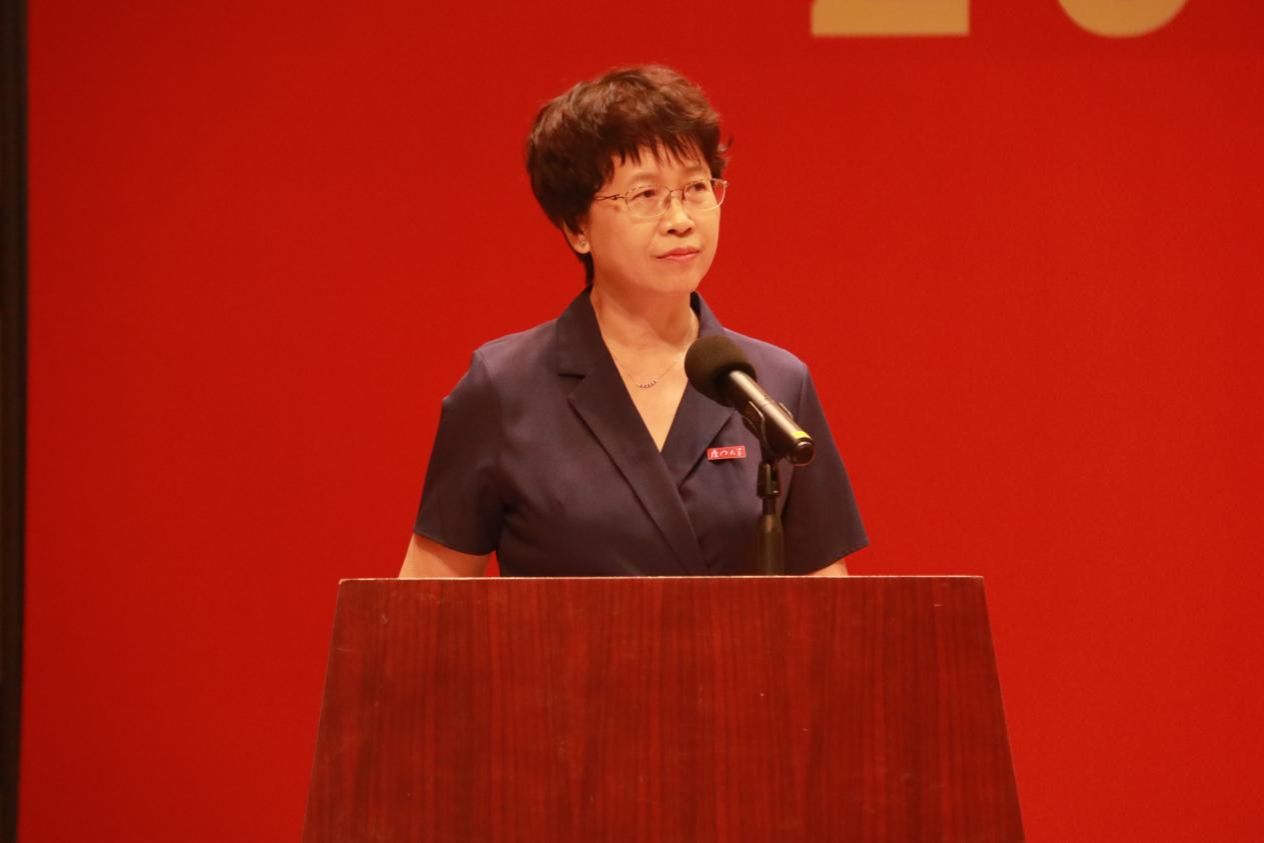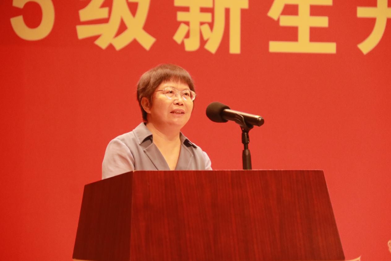 随后,全体起立奏唱国歌,激昂的旋律中,师生们共同抒发对祖国的热爱与对学院未来的期许。会上,陈菁发表讲话,她首先向2025级新生的到来表达了诚挚的祝贺与热烈的欢迎,并从学科发展历程和重要成就上阐述外文学院的历史传承与新时代的蓬勃姿态。面向百年未有之大变局,陈菁向新同学提出三点寄语:锻造高境界,善于识变、求变、应变;掌握专业本领,激发创新思维,发挥多元潜能;滋养人文情怀,敬畏生命万物,追求内心自洽。最后,她鼓励同学们积极参与跨学科培养项目,成为复合型人才,与百年外文彼此成就,共同精彩。