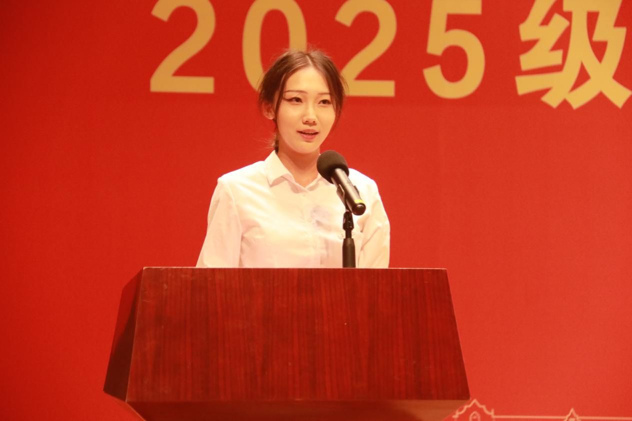 2025级德语专业本科生姜昕彤作为新生代表发言,回顾入学24天的成长与感悟,她表示,新生教育和军训是入学初最深刻的两课。前者让她明确了外文学子“让世界听懂中国声音”的使命;后者则锤炼了她“再坚持一下”的韧劲。她期待与所有新同学一道,不忘语言背后的关怀与温度,做文化的传递者和时代的译介人,用青春力量沟通中国与世界。