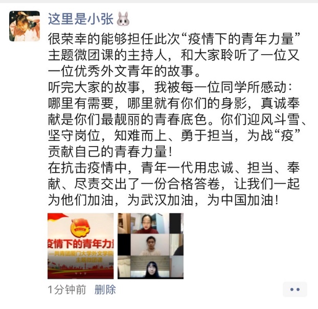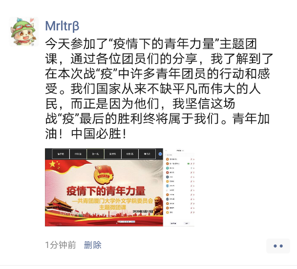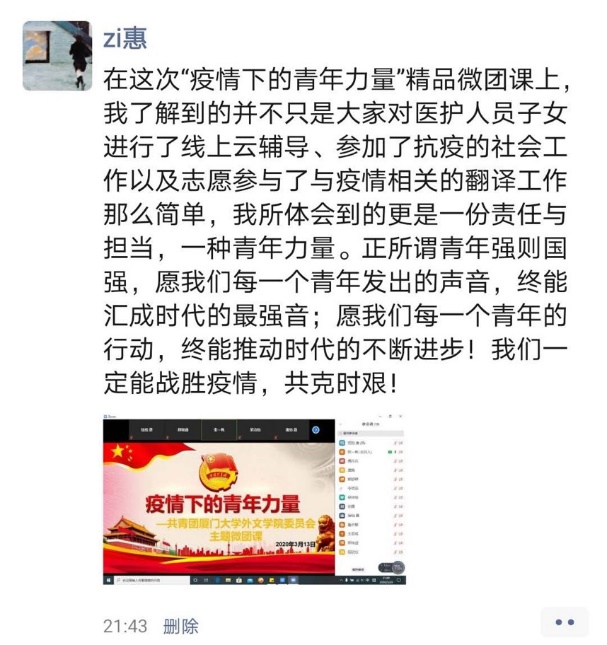 疫情的寒风无法阻挡春天的脚步。大地回春,万物复苏,“学雷锋月”如期而至,外文学子积极践行雷锋精神,青年团员们踊跃加入战“疫”队伍,争做一滴水、一束光,为新时代雷锋精神注入新鲜血液,以实际行动书写青年志愿服务的凯歌。志愿活动如火如荼进行的同时,外文学院本研46个团支部开展了以“疫情下的青年力量”为主题的微团课,分享志愿者们温暖动人的战“疫”故事和成长感悟,青年团员的责任心与爱国情让这个春天加速升温,显得格外明亮。