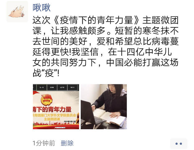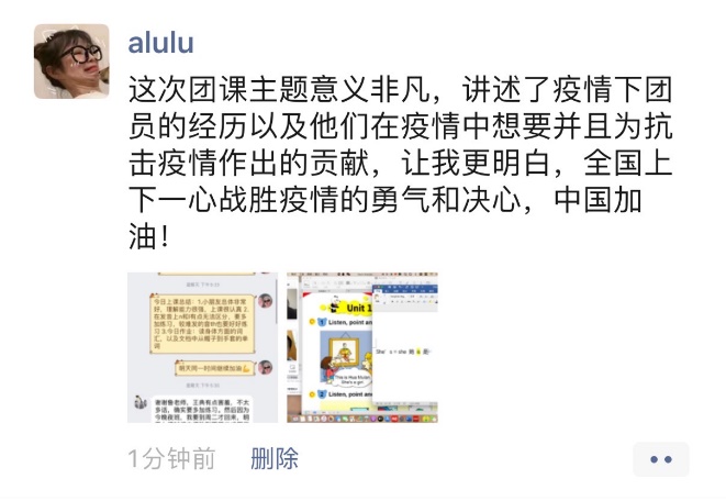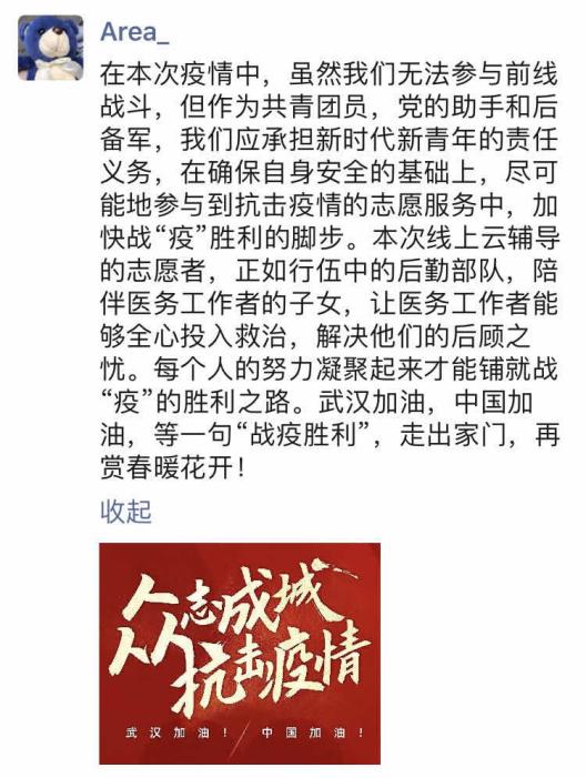 我希望我的辅导能带给孩子学业上的帮助,同时也能给予她一份温暖的陪伴。作为在校大学生,我能为疫情做的毕竟有限,而参与“云辅导”行动正好可以发挥自己的专长,为被疫情所困的祖国发光发热。于是,我主动担当,义无反顾。
