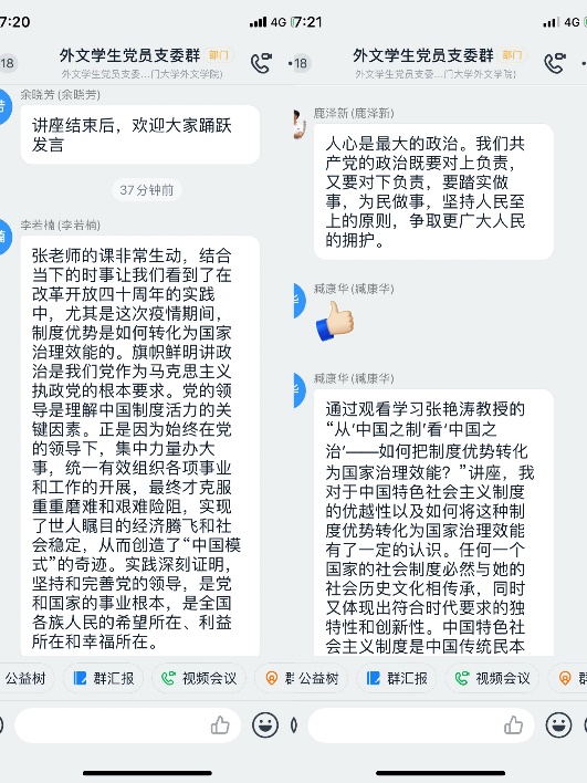 张老师的课非常生动,结合当下的时事让我们看到改革开放以来,尤其是这次疫情期间,制度优势是如何转化为国家治理效能的。正是因为始终在党的领导下,我国实现了世人瞩目的经济腾飞和社会稳定,从而创造了“中国模式”的奇迹。实践深刻证明,坚持和完善党的领导,是党和国家的事业根本,是全国各族人民的希望所在、利益所在和幸福所在。