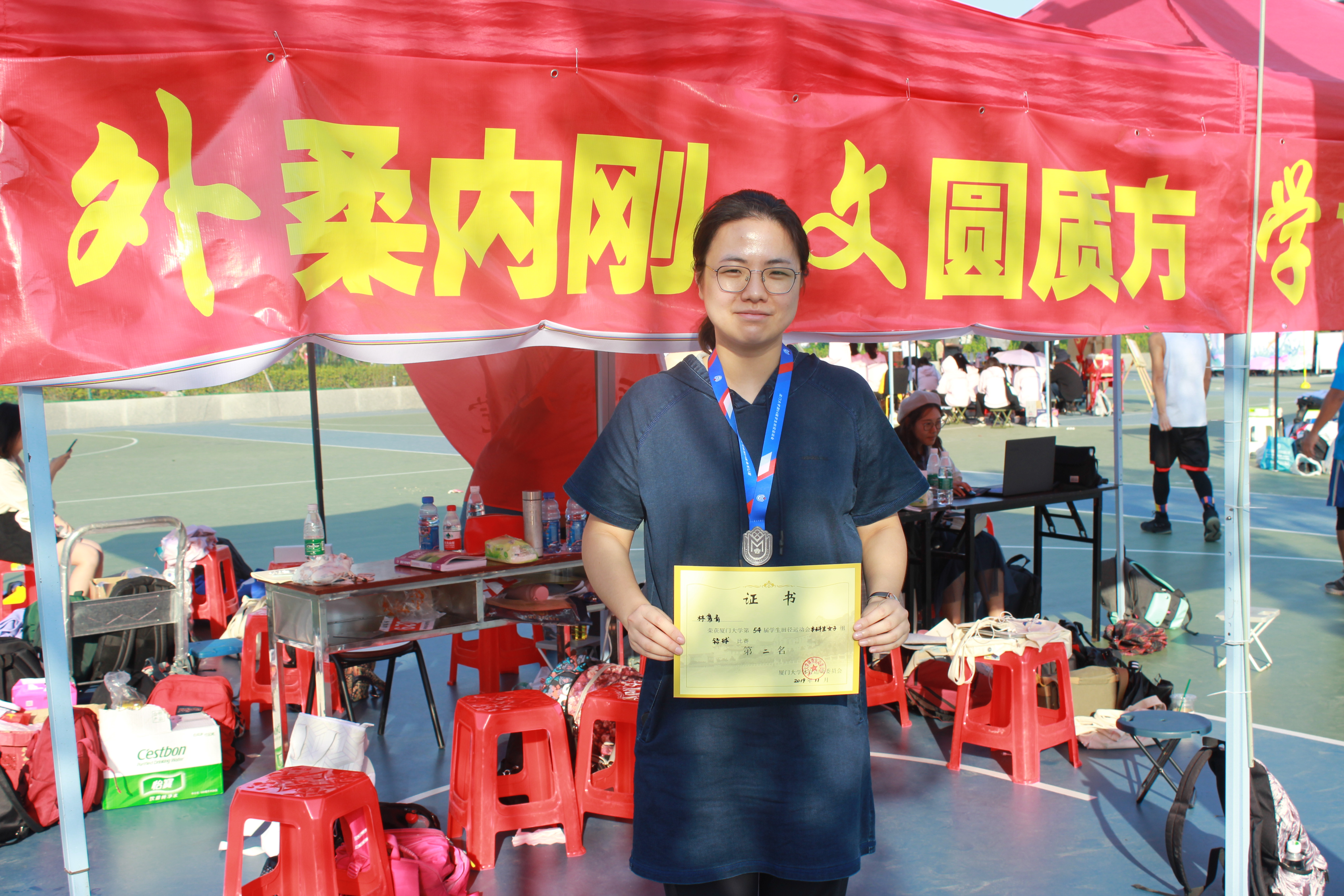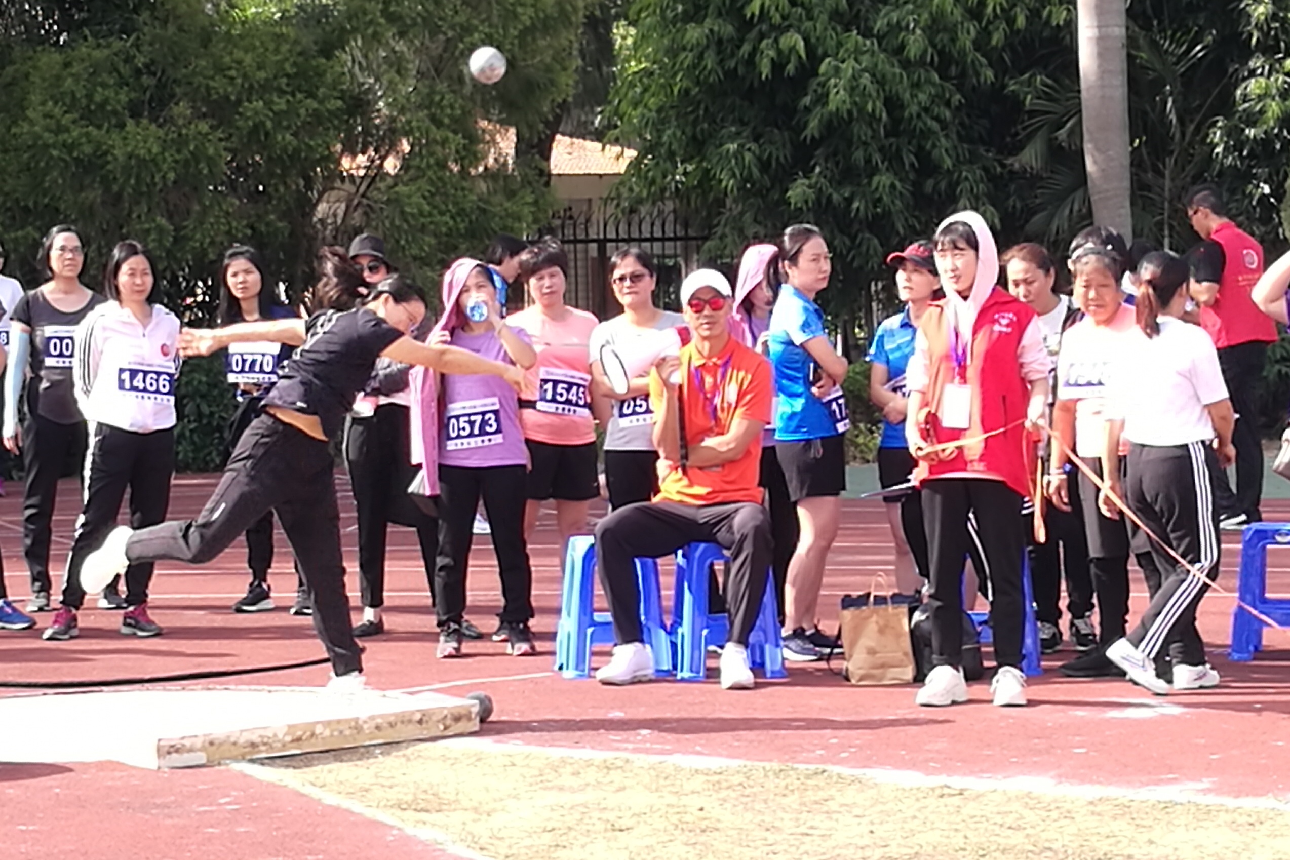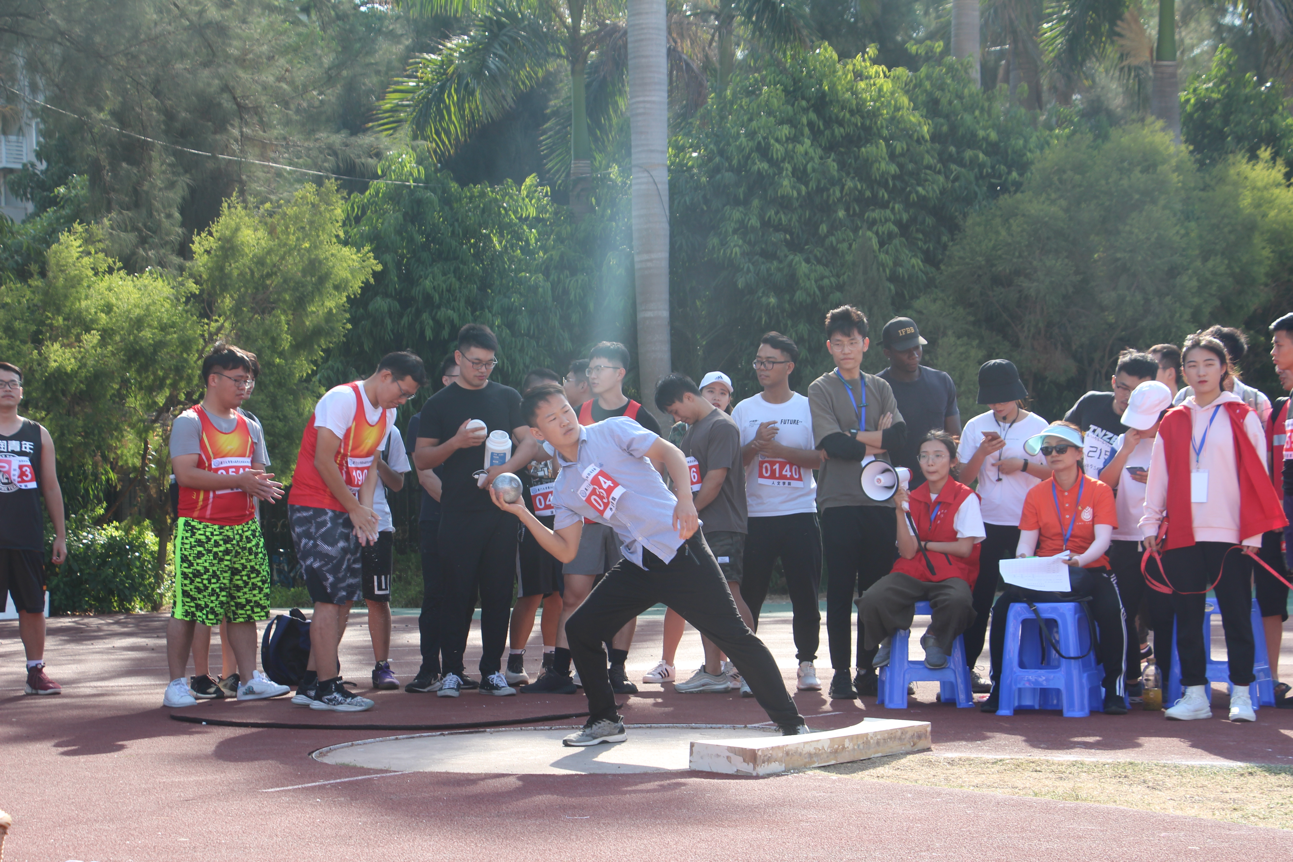 在田赛的另一个重要项目——铅球的赛场上,竞争也同样激烈。今年,2018级英语专业本科生林隽青同学代表外文学院参赛。伴随着发令枪声,她双手抱球,身体缓缓后倾,如弓满弦,蓄势待发!随即转向右手托球,缓而渐疾,铅球在空中划过一条流畅的弧线。在一次次投掷中,她渐入佳境,不断超越,最终投出了8.18米的好成绩,摘得亚军的桂冠。赛后,这位酷爱体育运动的女孩表示对这一次的成绩较为满意,也坦言自己小时候就接触过铅球训练,所以比赛时并没有感到紧张。可见想要在赛上取得惊艳的表现,离不开数年如一日的积淀。