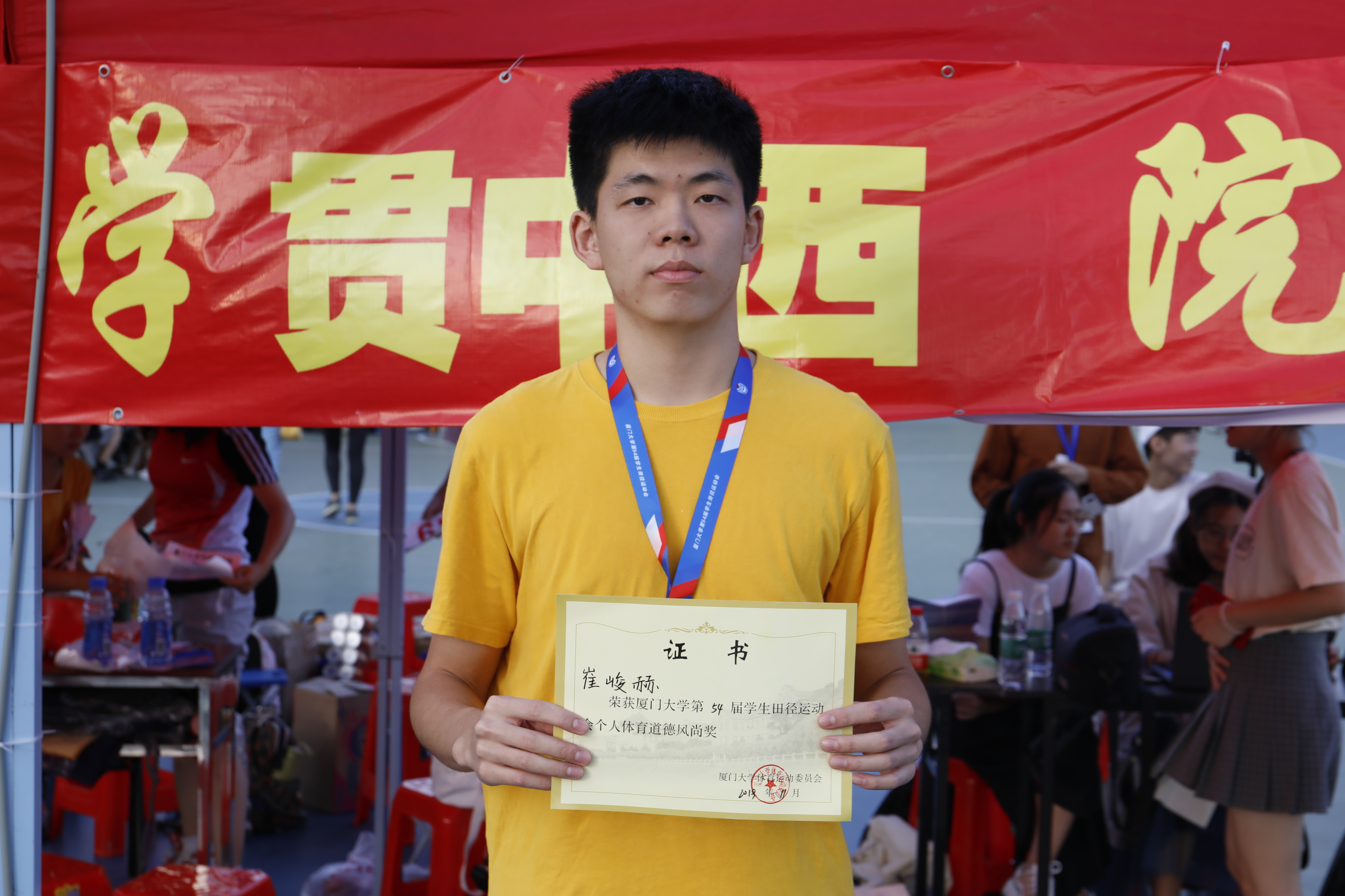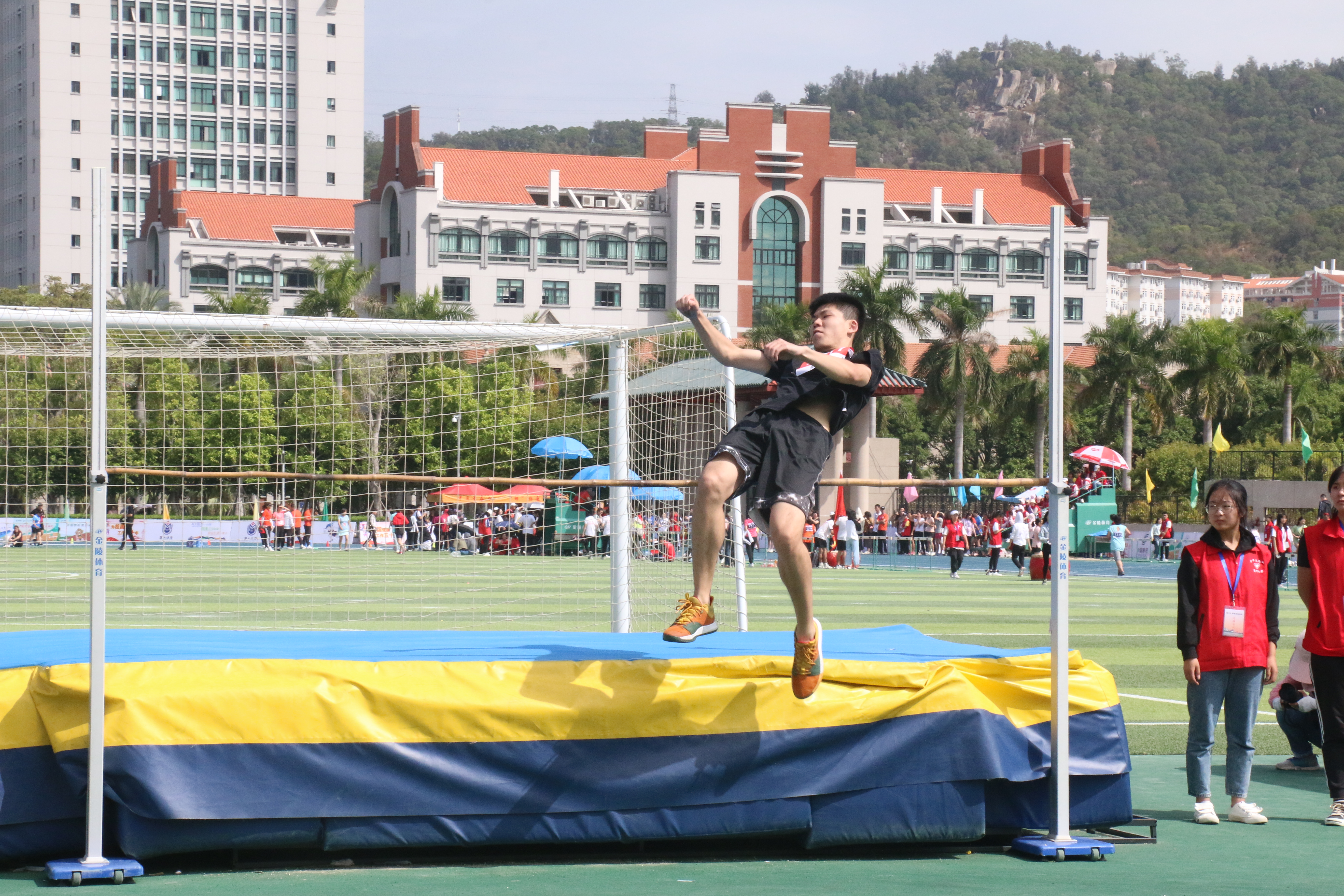 赛场上,外文学子们也在不断挑战自我。跳高项目的角逐异常激烈,外文学院派出有着两年参赛经验的“老将”——2017级法语专业崔峻赫同学。助跑、起跳、越杆、落地,一系列动作行云流水,他凭借娴熟的技巧和过人的实力斩获了本科生男子组跳高第三名,并摘得个人体育道德风尚奖,创下了个人的最好成绩。入学以来三次参赛,崔峻赫同学作为外文学院的一份子一直活跃在运动会的赛场上,儿时的他便已经对运动产生了浓厚的兴趣,常常参加体育锻炼,培养了良好的身体素质和坚定的意志力。赛后,他表示,“很高兴能在自己热爱且擅长的项目中为学院赢得荣誉。只要学院需要,我还会再一次站上赛场,争得属于外文的荣光!”