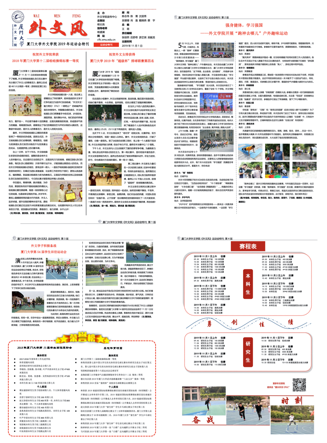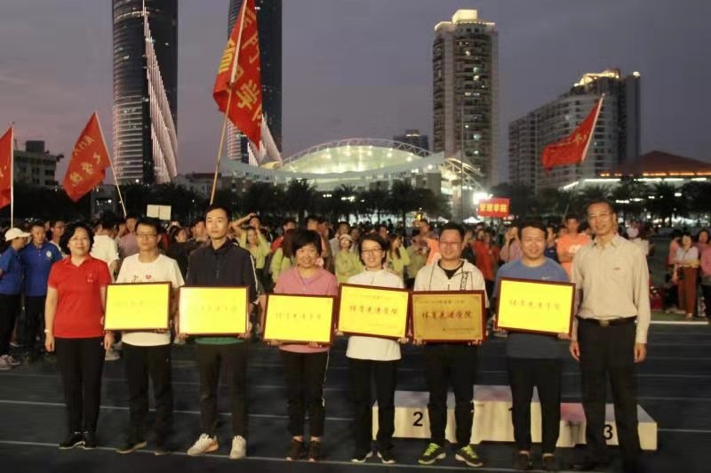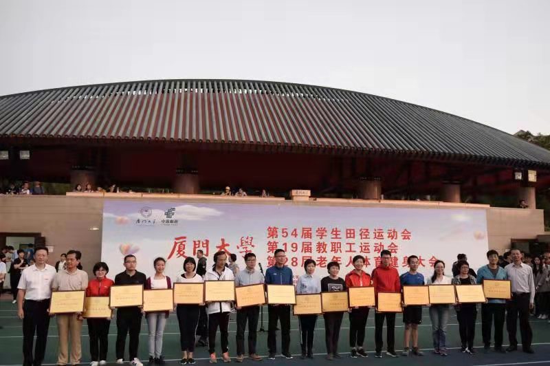 鹭岛金秋初至,演武场日落时分的微风伴着收获的喜悦,见证着外文人的又一载征程。11月1日至2日,厦门大学第54届学生田径运动会、第19届教职工运动会、第28届老年人体育健身大会顺利举行。在本届运动会上,外文师生奋勇拼搏,团结协作,最终,学院荣获“厦门大学第十九届教职工运动会体育道德风尚奖”。同时,凭借有序的竞赛组织和突出的竞赛表现,外文学院获评“2018-2019年度厦门大学体育先进学院”。