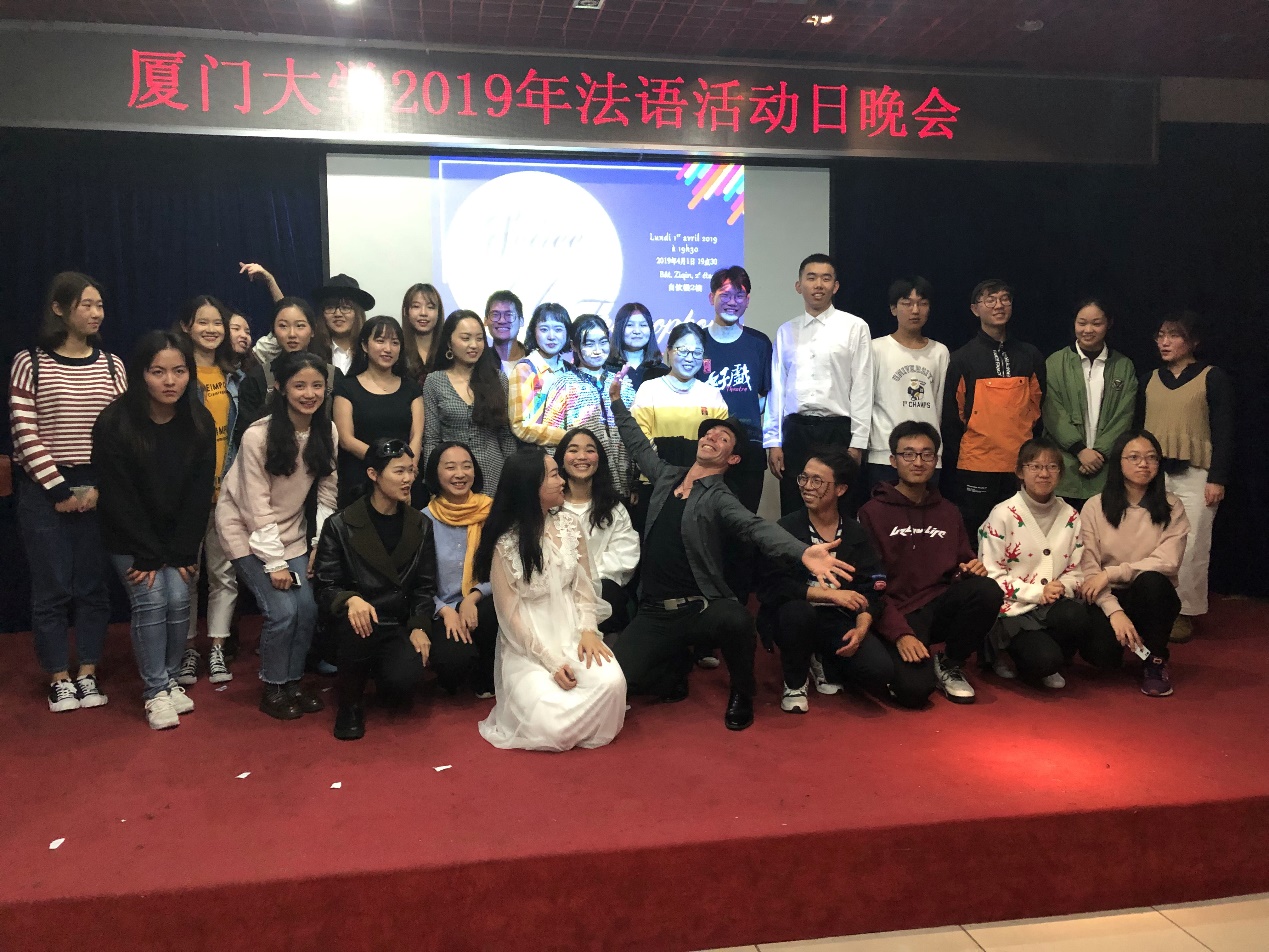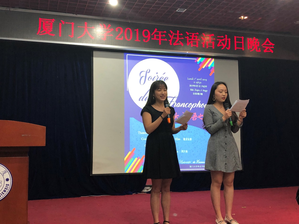 一年一度的法语活动月又如约而至,2019年4月1日,外籍教师Guillaume LABOURDETTE组织法语系师生在自钦楼多功能厅举办厦门大学法语活动日晚会——“厦大法语之夜”。本场晚会由2018级研究生武瑶、钱雅蓉两位同学主持,2018级研究生沈洁欣同学主持电影配音比赛并做部分口译。