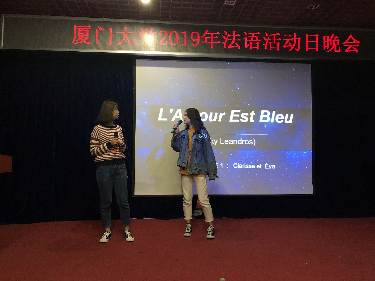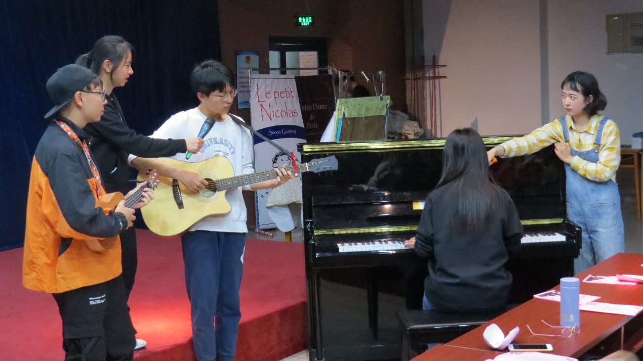 歌曲环节中,大二大三同学们准备的L’amour est bleu和Ton combat两曲带来浓郁的法式风情。L’amour est bleu的浪漫气息随着女声唱响,Ton combat在钢琴和吉他的伴奏中活跃起来,又有鼓舞人心的能力。