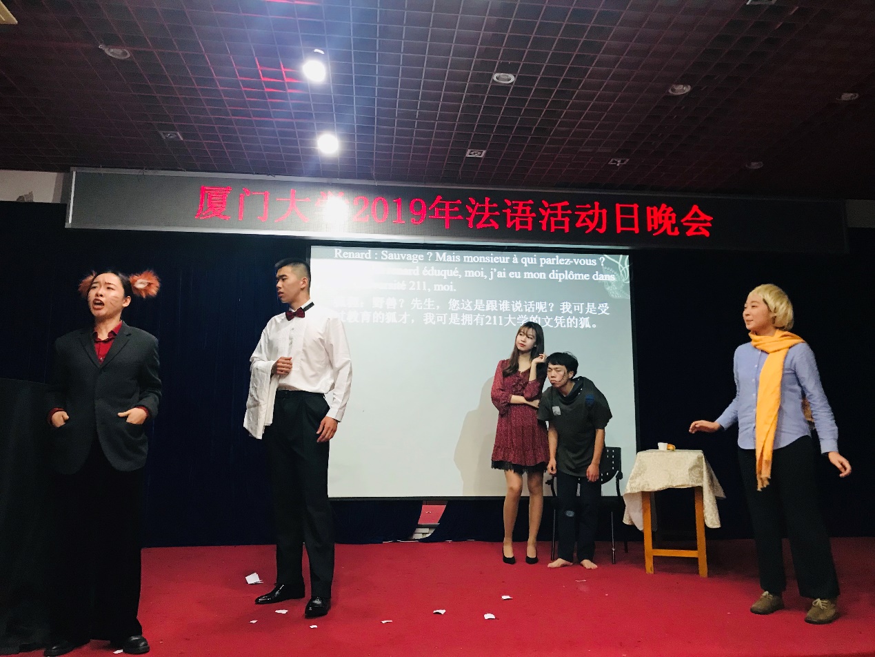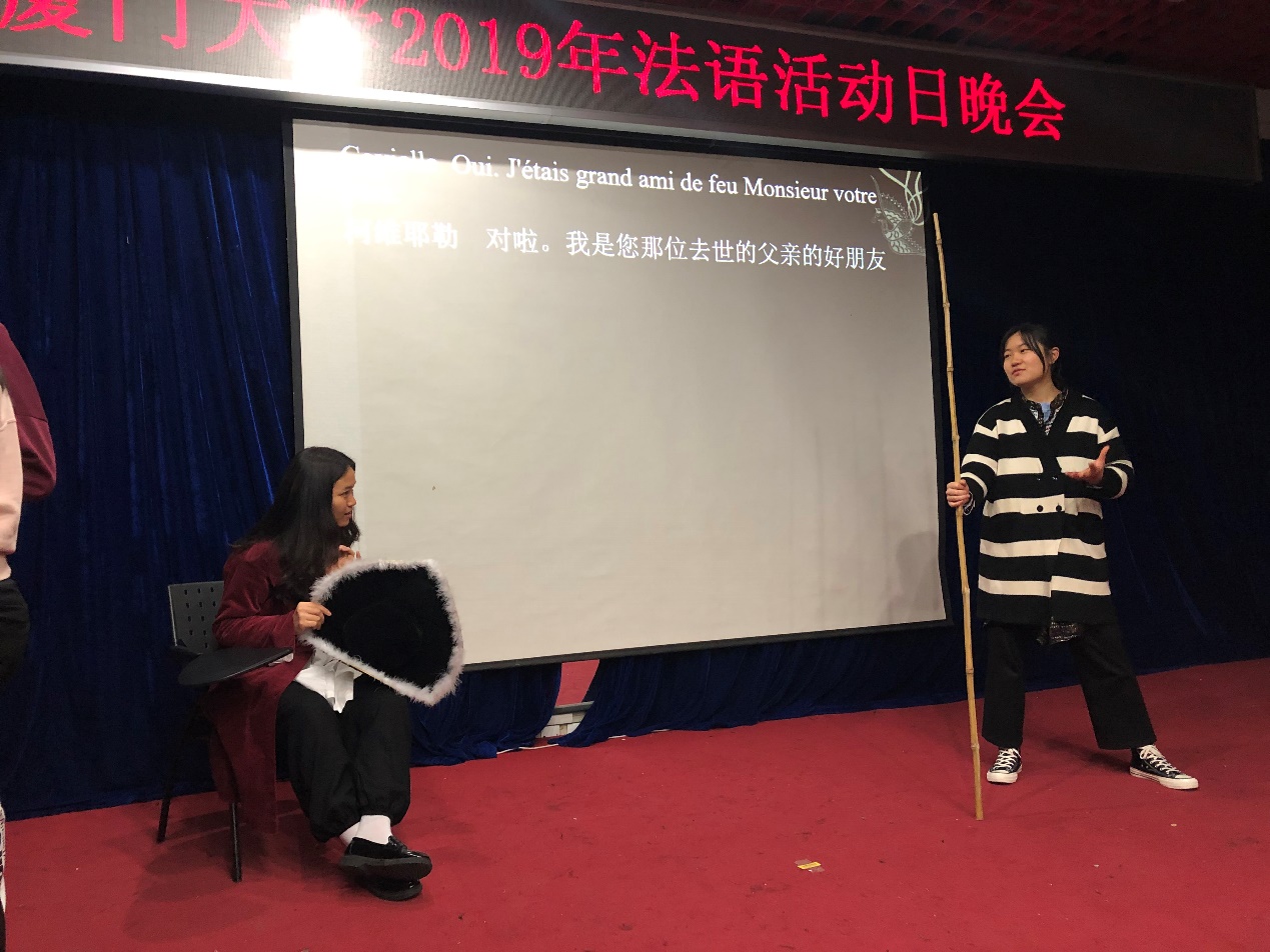开场节目是由2017级本科生陈星霞、萧凤杰两位同学演绎的17世纪喜剧大师莫里哀《贵人迷》的选段,该表演曾获得第三届全国法语戏剧大赛总决赛中荣获一等奖,而在法语活动日晚会上,两位同学精湛的演技将观众们带回了17世纪的法国剧场,赢得了观众的一片掌声。