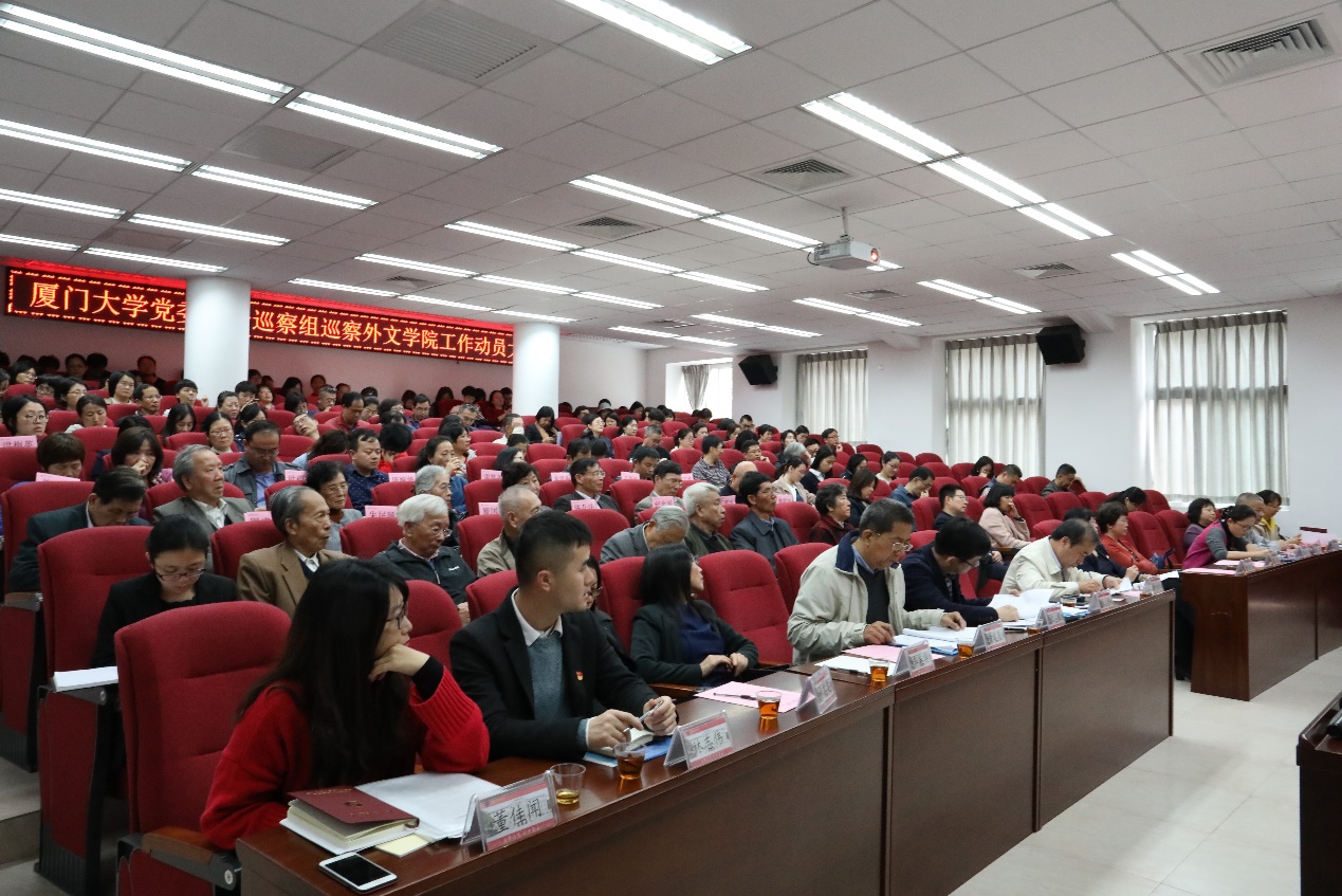 根据厦门大学党委关于开展第二轮巡察工作的相关部署,4月3日下午,校党委第一巡察组巡察外文学院党委工作动员大会在德贞楼112报告厅召开。校纪委副书记、纪委办主任、巡察办主任林金枝,第一巡察组组长叶鹏飞,副组长宋毅、黄定基,巡察组成员黄艳萍、陈文、王海凤,联络员林志伟、董佳闻出席了大会。大会由外文学院党委书记陈志伟主持,学院院长陈菁,党委副书记杨云良、沈丽秀,副院长李美华、徐琪、辛志英、吴光辉等党政领导班子成员,全体教职员工及离退休同志代表参加了此次会议。