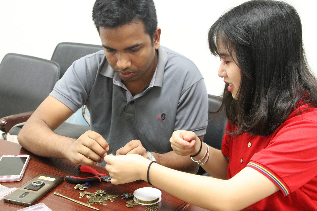 实践队还组织了以古簪制作为主要内容的中国传统手工艺术教学活动,简要介绍并带领留学生亲手制作中国传统发饰,体验中国传统手工制作之美。在实践队员们的耐心指导下,留学生们自己动手,制作出了一个个精美的古簪作品,感受到中国传统手工的精致独到之处。