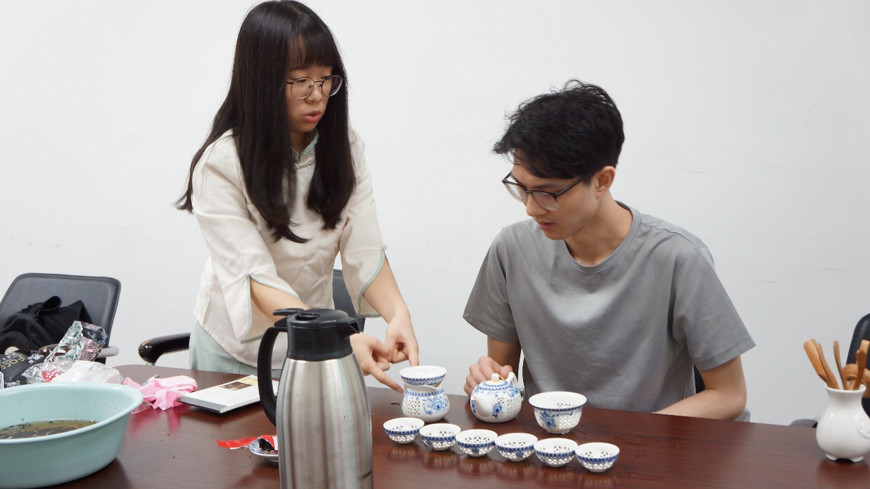 7月8日,茶艺课程正式开始。实践队员们为大家科普了中国常见的茶叶种类,还带来了精彩的茶艺表演。留学生们也积极参与,一边学习知识,一边品茶践礼,纷纷选出自己最喜爱的茶叶种类,并主动尝试为在场的同学们泡茶。