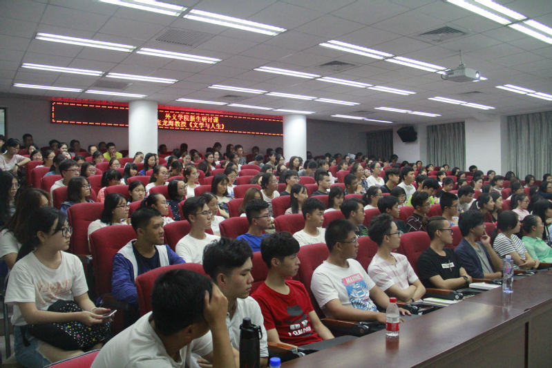 10月13日晚7点,外文学院院长、博士生导师张龙海教授在南光三112报告厅给2017级本科新生带来了一场主题为“喜迎十九大·文学与人生”的研讨课,由英语语言文学系副主任林斌教授主持。2017级本科生辅导员蔡宇老师及全体本科新生出席。