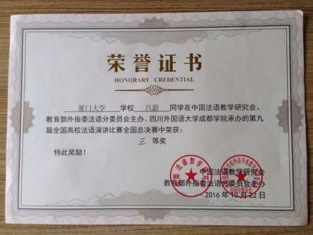 第九届“卡西欧杯”全国高校法语演讲比赛总决赛于20161022日在四川外国语大学成都学院举行。我院法语系选送的2013级吕蔚同学经过两轮演讲(命题演讲:“L’importance de l’échange humain人类交际的重要性”和即兴演讲),获得三等奖!这是厦门大学法语系学生第5次获得此全国法语界重大学业竞赛奖项。