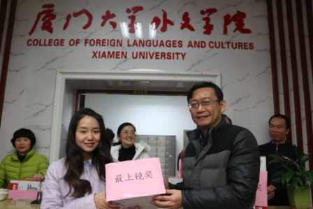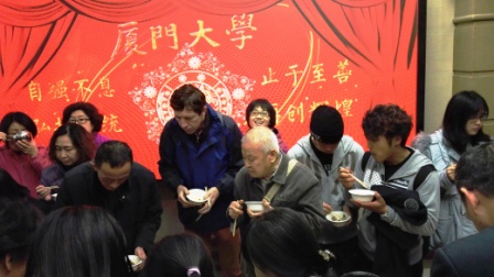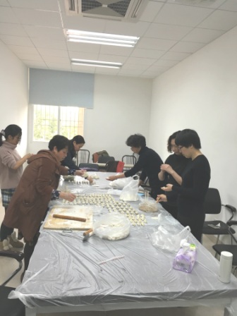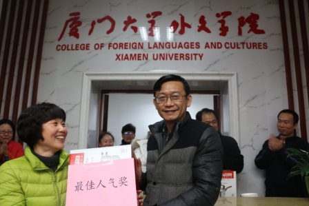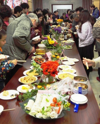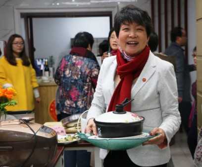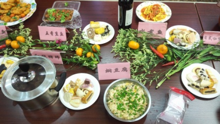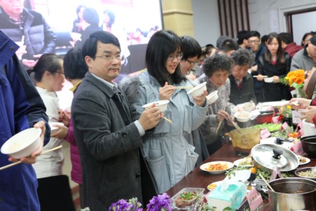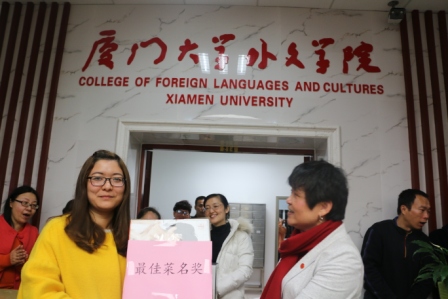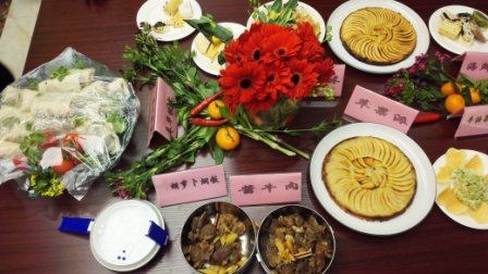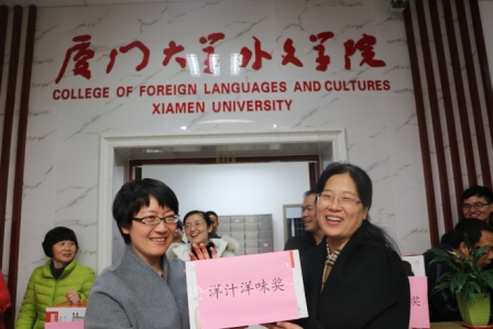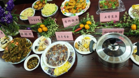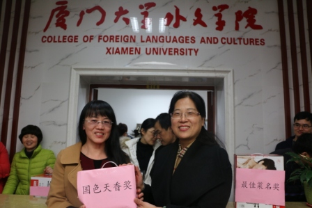 为庆祝“三八”国际妇女节、展现外文学院女教工的巾帼风采,3月11日下午,由外文学院妇委会和工会精心组织举办的“舌尖上的外文――庆‘三八’手工料理欢乐分享会”在南光三二楼欢乐举行。一场饕餮盛宴,不仅欢悦了教职员工的视觉和味蕾,更凝聚了外文人的心。 活动得到校工会和妇委会的大力支持。校关工委主任陈立文、校工会常务副主席宋毅、校妇委会主任蒋月等领导老师应邀前来参加分享会。从活动的策划到现场组织,学院党、政领导高度重视,全员参与。本届分享会还专门邀请学院的离退休教职员工、外籍教师、学生代表以及日本参访学生参加,大家欢聚一堂,其乐融融,以颇具创意的形式,精心烹制的料理,再次谱写出华丽的锅碗瓢盆交响曲。 “欢乐分享会”继续保留了传统集体项目――包饺子,并力求饺子的味道和外形俱佳,共同打造高品质高颜值水饺。历年来,包饺子都是教职员工参与度最高的活动,今年也不例外。饺子制作高手们下挤、擀皮、包馅、捏制,手腕翻飞之际,欢声笑语相随,几百个高颜值水饺迅速成型。欢快热闹的气氛让迟来帮忙的老师们大呼错过美好时光。 下午五点,报名参加手工菜品展示活动的老师们陆续到场,将精心准备的独家秘制私房菜摆上用鲜花和蔬果装饰、点缀的展示台。从中式私房菜到日式经典菜肴、西式料理,40多道手工菜品争奇斗艳,香气四溢,令人垂涎欲滴。不仅菜品活色生香,菜名也起的充满诗意。舌尖上的精灵、糖香酥、人间烟火、凤骨龙姿、年年有余、牛羊成群、春华秋实,一道道菜名令人浮想联翩、耳目一新。 下午五点三十分,外文学院副院长、妇委会主任徐琪教授作为本次活动的主持人,宣布第三届“舌尖上的外文――庆‘三八’手工料理欢乐分享会”正式开始。外文楼瞬间成为欢乐的海洋,师生员工共享美食的盛宴。大家在一盘盘美食前留恋缱绻,细细品鉴,畅快地交流意见,宛如一个大家庭再次欢度新年。 经过大众评审们的认真品鉴,大家翘首以待的“神秘大奖”终于一一揭晓:陈端端老师以六份色、香、味俱全的菜品蝉联外文学院“女厨神”称号, 成为本届分享会全能金牌得主;张龙海老师以一款香味浓郁、色泽淡雅的炒米粉摘得外文学院“男厨神”的桂冠;洪梅英老师及其团队以外酥里嫩、香传千里的海蛎炸荣获“最佳人气奖”;林斌老师以别出心裁的一种土豆三种吃法荣获“最佳创意奖”;朱丽航老师以分装在玲珑剔透的玻璃小瓶中的细腻柔软、甘甜适口的水果布丁荣获“最上镜奖”;杨盛澜老师以一道“舌尖上的精灵”荣获 “最佳菜名奖”;张淑芬老师以制作精巧、色形俱佳的百花酿香菇荣获“国色天香奖”;沈澍老师以充满浓郁法国风味的苹果派荣获“洋汁洋味奖”;鲁京明老师和林晓英老师分别以地道的闽南春卷和大骨汤获得“乡里乡亲奖”。校、院领导老师为获奖教师颁发了锅、碗、瓢、勺等别具一格的纪念品,将活动现场的欢乐气氛再次推向了高潮。 作为争创全国巾帼文明岗的特色活动,“舌尖上的外文――庆‘三八’手工料理欢乐分享会”活动已经成功举办了三届。每一年的活动都留下了无数精彩的瞬间,成为师生员工共同的美好记忆。 “庆‘三八’手工料理欢乐分享会”的成功举办,不紧充分展示了学院教职工的精湛厨艺,体现了外文人对生活的热爱、对美的追求,更加深了教职员工相互之间的友好情谊,彰显出外文大家庭的和睦风采。  三八手工菜现场,热闹非凡