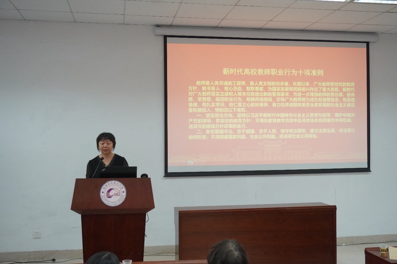 为进一步增强我院教师的责任感和使命感,进一步弘扬新时代高校教师道德风尚,外文学院党委委员、副院长徐琪带领全院教职员工对《新时代高校教师职业行为十项准则》进行再学习。徐琪副院长对《准则》中坚定政治方向、自觉爱国守法、传播优秀文化、潜心教书育人等十个方面的内容进行了逐条解读。她谈到,作为高校教师,要严格要求和规范个人言行,恪尽职守,将立德树人根本任务贯穿于个人教育教学的全过程,努力做到德高为师,身正为范。