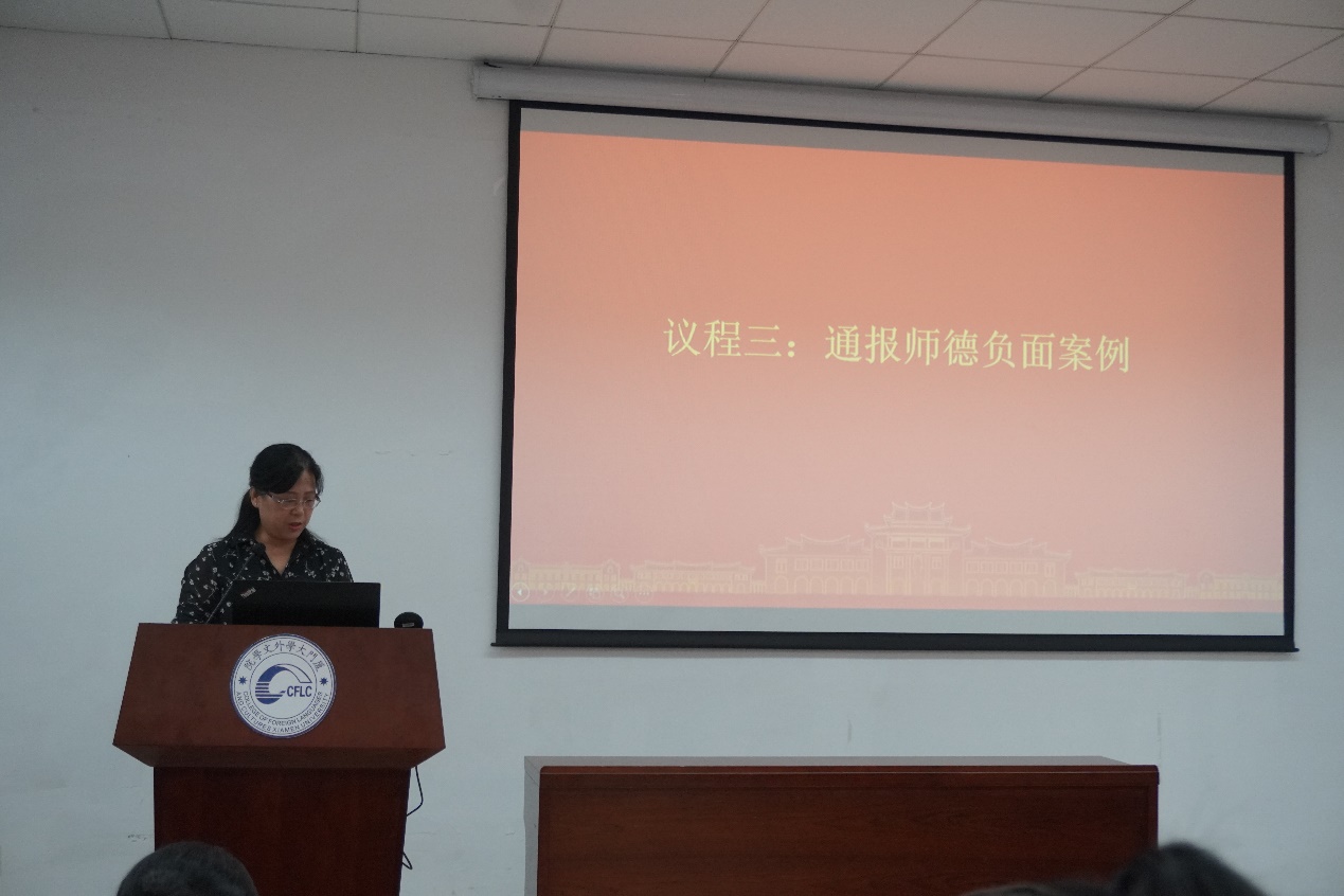 会上,陈志伟书记通报了师德负面案例,并强调了学院年度师德师风考核评价流程。她指出,学院全体教职工要严格遵守教师职业规范和职业道德,强化底线、红线意识,真正把教书育人和自我修养结合起来,时刻做到自警、自省。她强调,学院对于违反师德师风的问题,坚持“零容忍”原则,同时,学院将层层压实师德师风建设的主体责任,时刻紧绷师德底线这根弦,从源头上防范和遏制违反师德事件的发生。