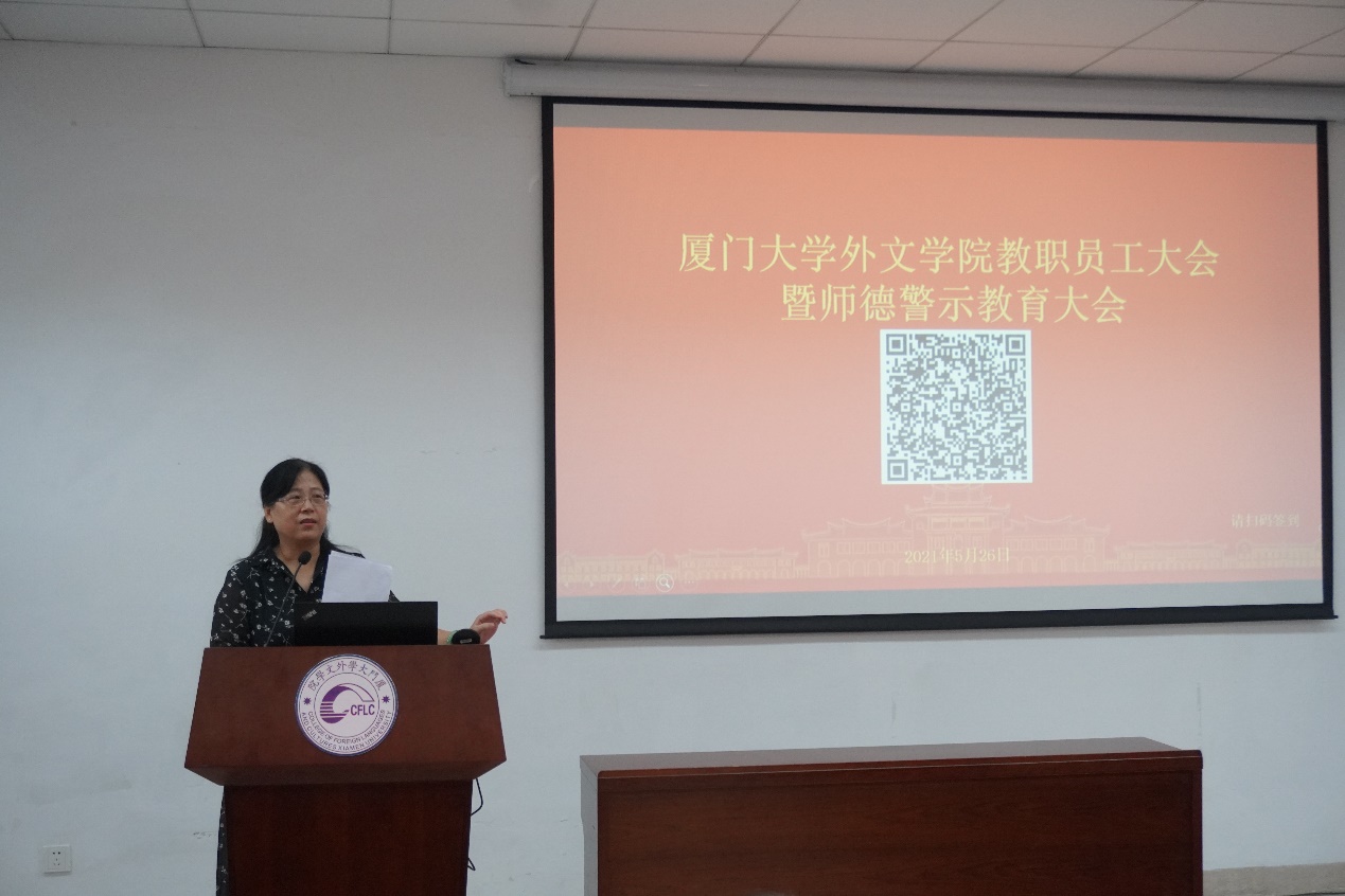 5月26日下午,为深入学习贯彻习近平总书记关于教育的重要论述和教师工作的重要指示精神,落实校党委关于师德师风建设的工作要求,外文学院在德贞楼112会议室组织召开教职工大会暨师德警示教育大会。校基层党建工作联络员黄定基、学院党政领导班子成员出席会议,全院教职员工参加本次会议,会议由外文学院党委书记陈志伟主持。