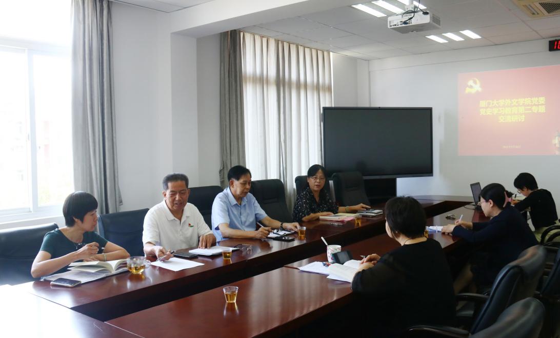5月26日上午,在聆听了李德元副教授讲授的第二专题报告和自学基础上,外文学院党委在德贞楼524会议室进行党史学习教育第二专题交流研讨。校党史学习教育第五指导组组长杨敬达,校基层党建联络员黄定基莅临指导本次会议。外文学院党委书记陈志伟,党委副书记沈丽秀,党委委员、副院长徐琪、辛志英参加本次交流研讨,本次学习由陈志伟主持。